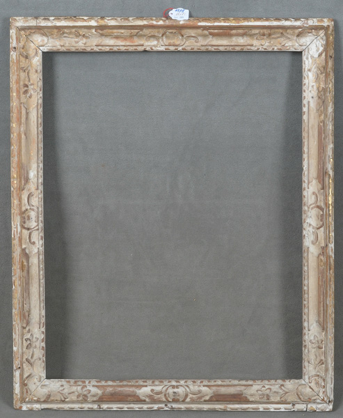 - Katalog-Nr: 1878Barock-Rahmen. Wohl Italien 18. Jh. Massivholz, geschnitzt mit Blättern, Kerben und Rocaillen, auf Kreidegrund Reste alter Vergoldung, 66,5 x 52,5 cm.o.L.