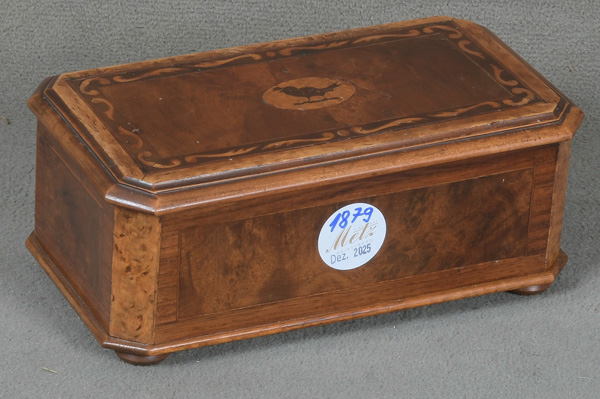 - Katalog-Nr: 1879Schatulle. Deutsch 19. Jh. Nussbaum und Vogelaugenahorn furniert und marketiert mit Fadenmuster, Rocaille- und Vogeldekor; Kugelfüße, rechteckig mit abgeschrägten Kanten, überstehende, profilierte Deckplatte, H=8 cm, B=21 cm, T=12 cm.o.L.