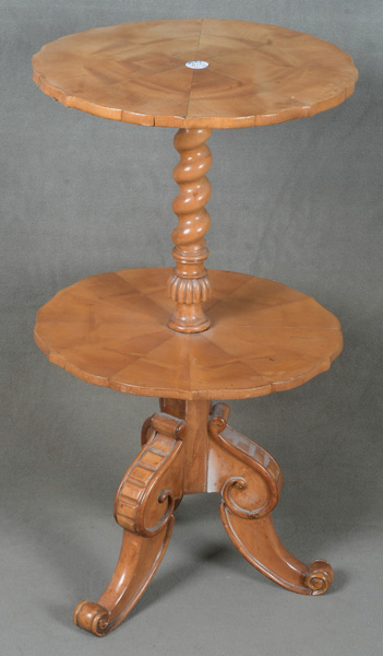 - Katalog-Nr: 1882Étageren-Tisch. Deutsch 19. Jh. Kirschbaum furniert, teilw. massiv und geschnitzt mit Kanneluren, Noppen und Rocaillen; dreipassiger Fuß, gedrechselte Mittelsäule, zwei Ablageplatten mit geschweiften Kanen, H=78 cm, D=42 cm.o.L.