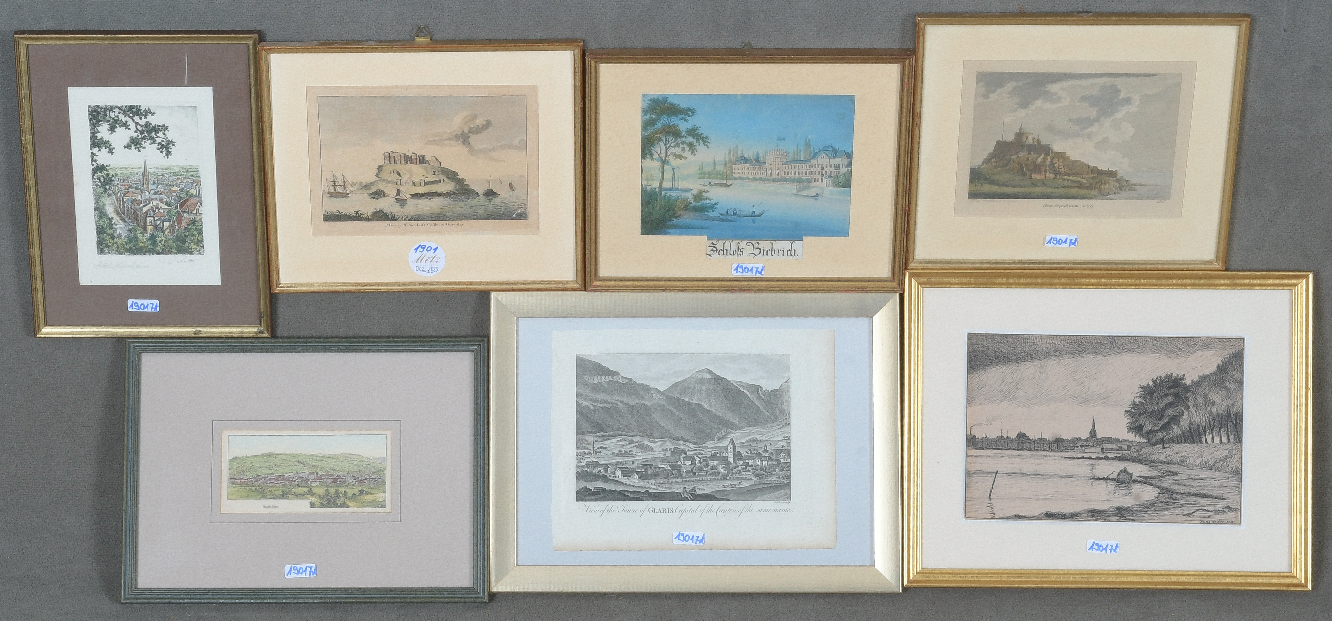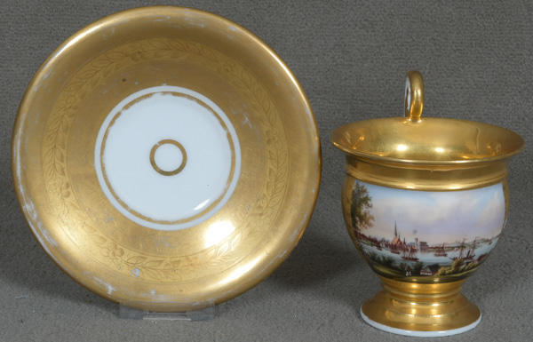 - Katalog-Nr: 1917Ansichtstasse mit Unterschale. Wohl Böhmen 19. Jh. Porzellan, bunt bemalt mit der Ansicht von Kiel, gold gehöht, radiert und poliert; ohne Marke.o.L.