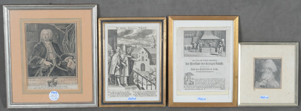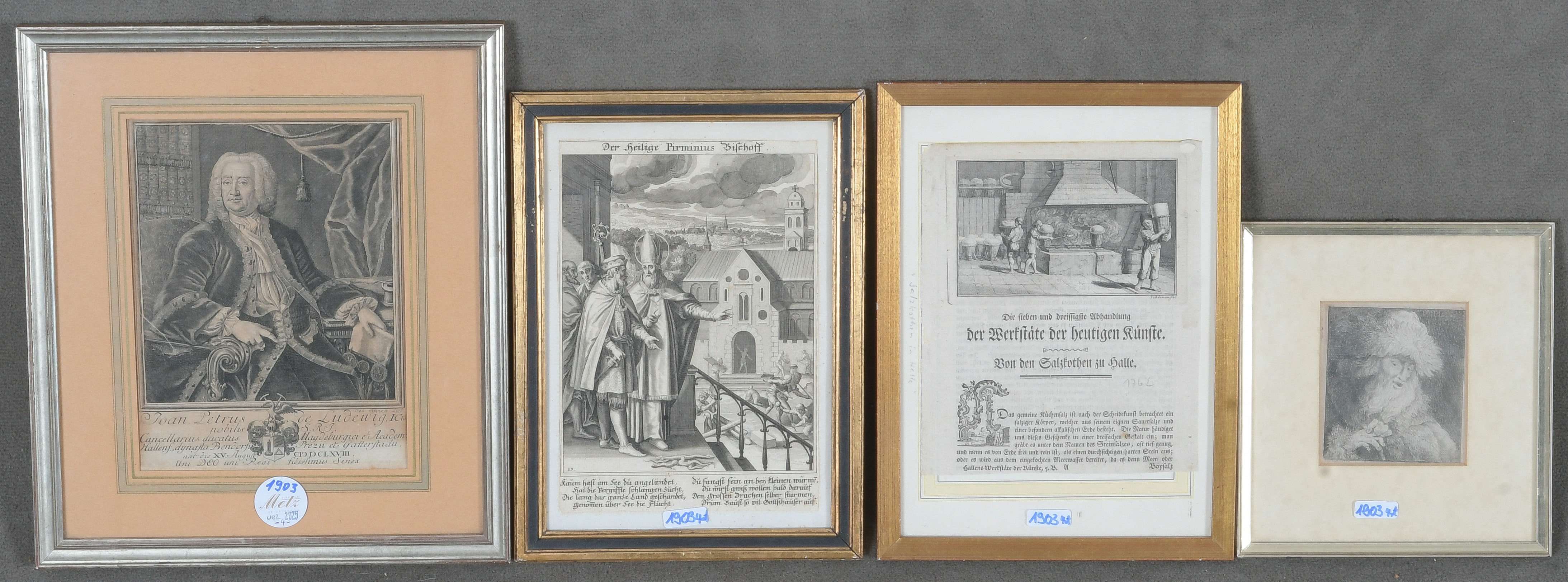 - Katalog-Nr: 1903Pieter I Barbiers (Graphiker des 18. Jhs.). Konvolut Porträts und Zunftdarstellung. Kupferstiche, eines li./u./sign./dat. 1760, zwei mit Passepartout hi./Gl. gerahmt, 9 x 8 bis 16 x 14 cm.o.L.