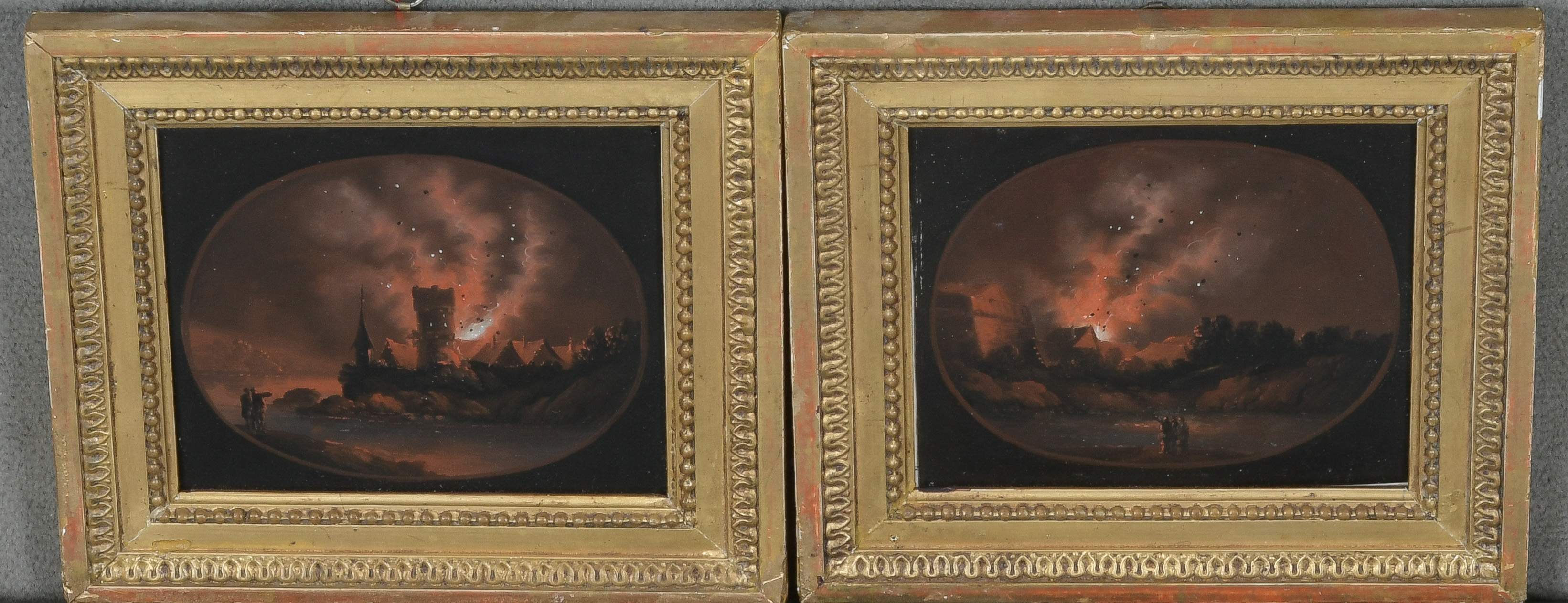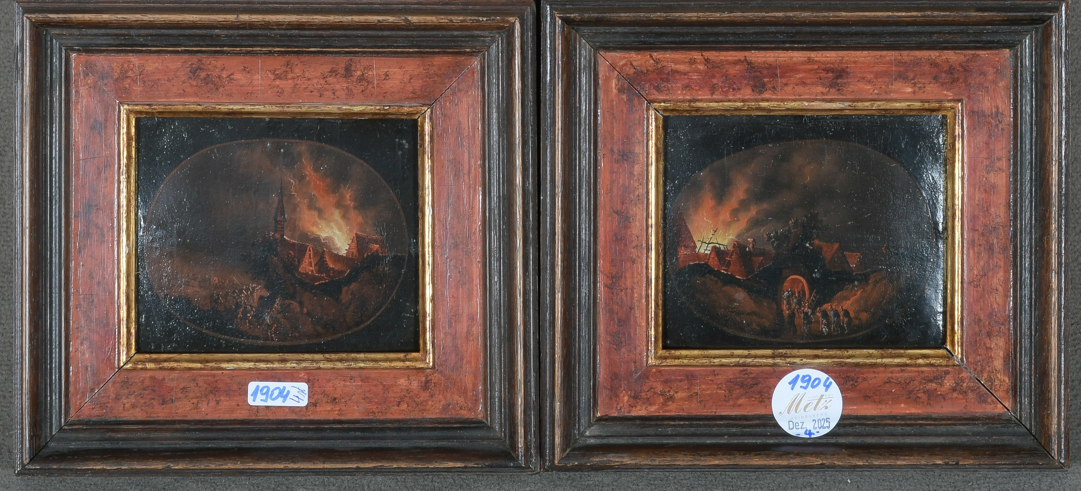 - Katalog-Nr: 1904AJohann Georg Trautmann (1713-1769) attrib. Zwei „Kleine Feuersbrünste“. Öl/Malkarton, eines re./mittig/sign./dat. 1767, gerahmt, je 12,5 x 14,5 cm. Vgl. G. Kölsch, „Johann Georg Trautmann (1713-1769) Leben und Werk“, Peter Lang Verlag 1999, S. 256 ff.o.L.