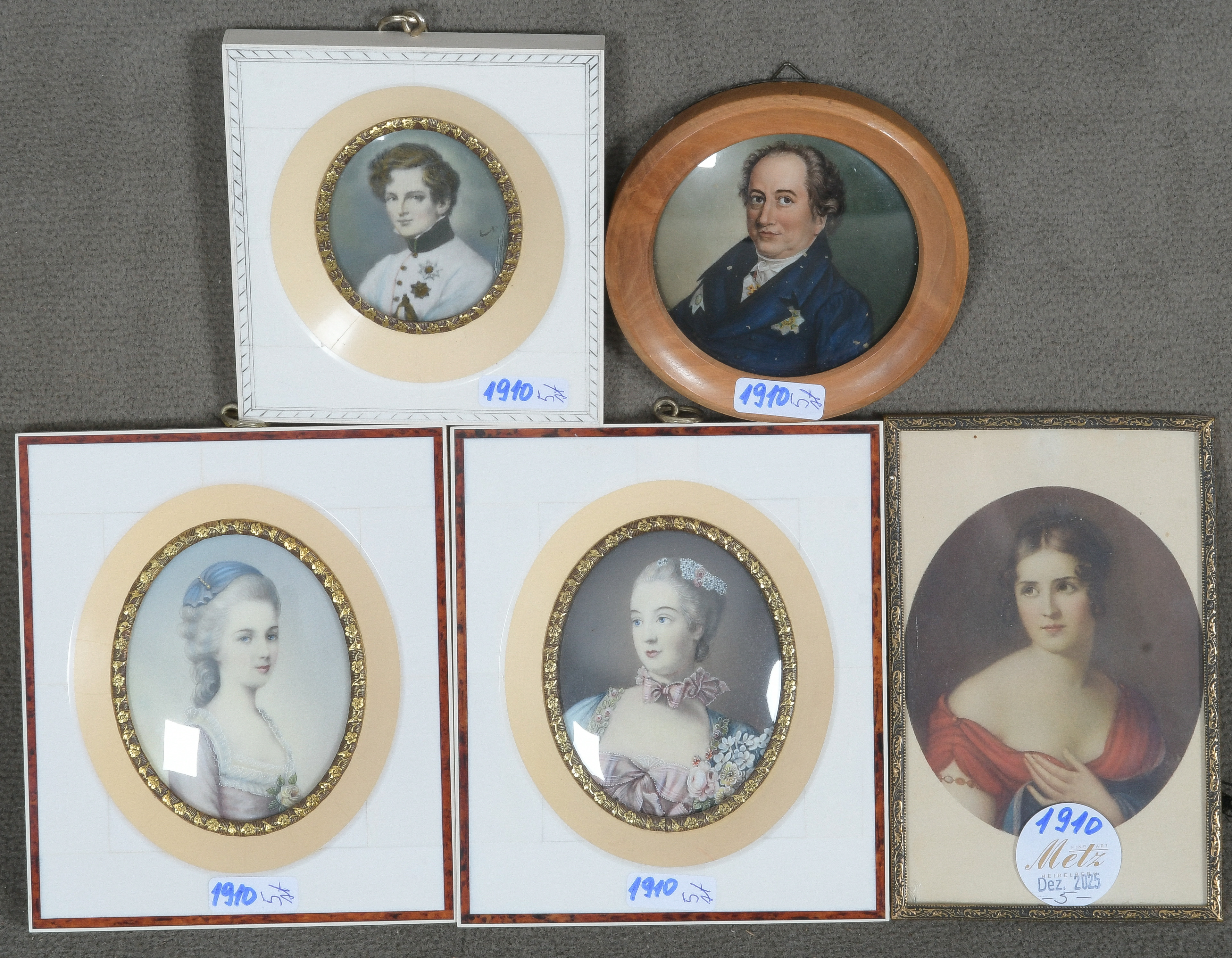 - Katalog-Nr: 1910Miniaturist des 19./20. Jhs. Fünf Damen- bzw. Herrenporträts, hi./Gl. gerahmt, 6 x 5 bis 10 x 8,5 cm.o.L.