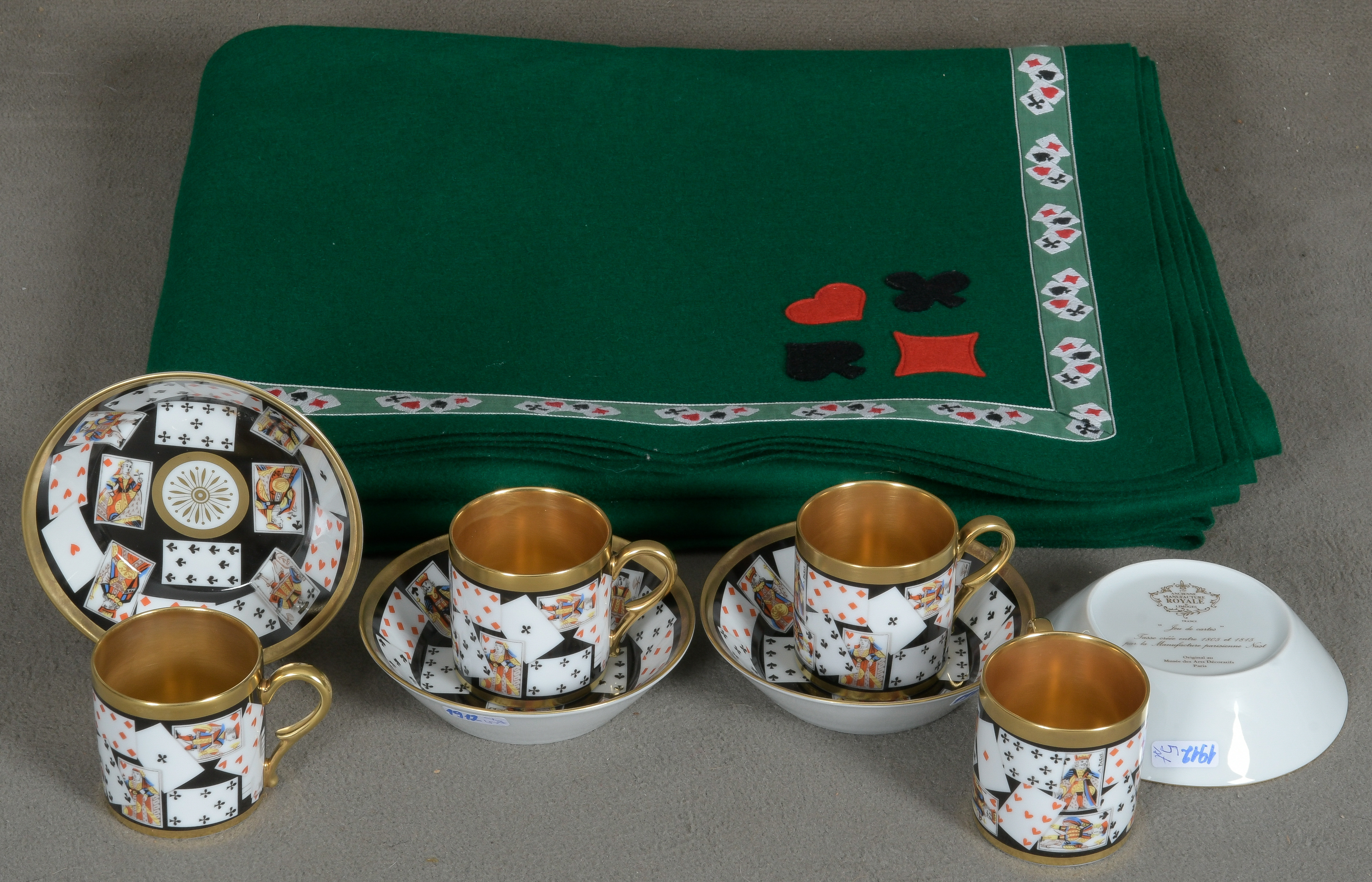 - Katalog-Nr: 1912Vier Tassen mit Unterschalen „Jeu de Cartes“. Limoges 20. Jh. Porzellan, bunt dekoriert; am Boden gemarkt; dazu Tischdecke mit Spielkartendekor, 144 x 180 cm.o.L.