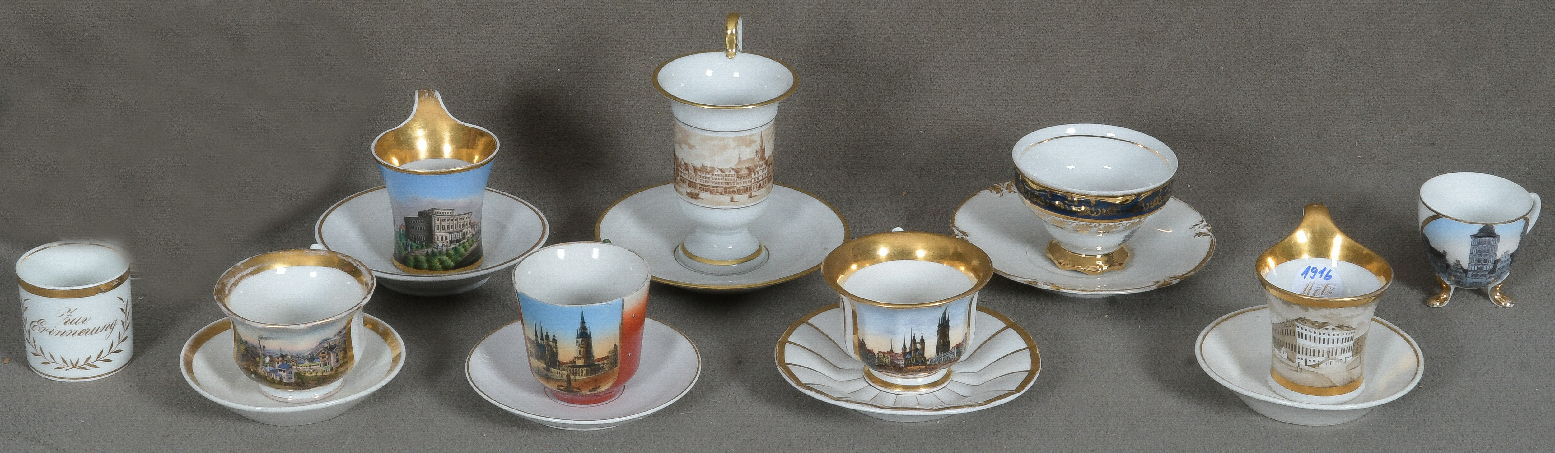 - Katalog-Nr: 1916Sieben Tassen mit Unterschalen, u.a. Berlin / Kaiser / Meissen 19./20. Jh. Porzellan, meist bunt bemalt, u.a. mit Ansichten von Berlin, Halle, Bad Wittekind; am Boden gemarkt.o.L.
