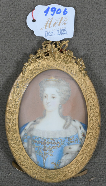 - Katalog-Nr: 1906Wohl französischer Miniaturist des 18. Jhs. Porträt von Maria Karolina Zofia Felicja Leszeczynska, Gattin von König Ludwig XV, in vergoldetem Bronzerahmen, 8 x 5,5 cm.o.L.