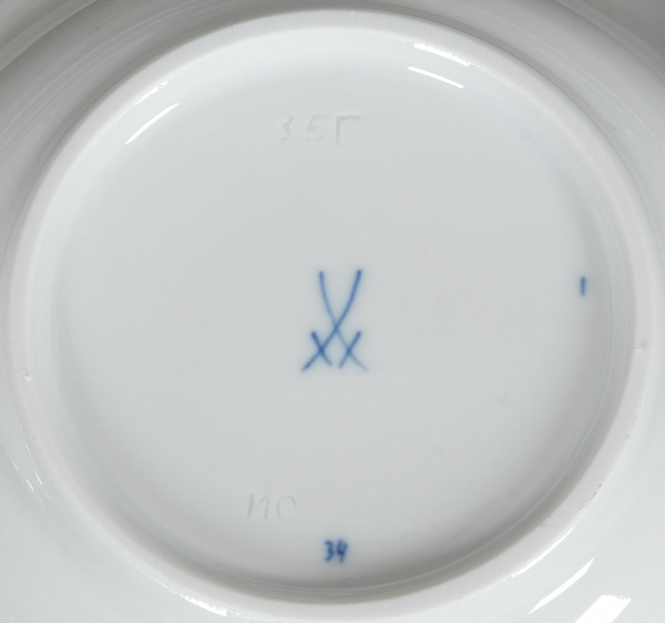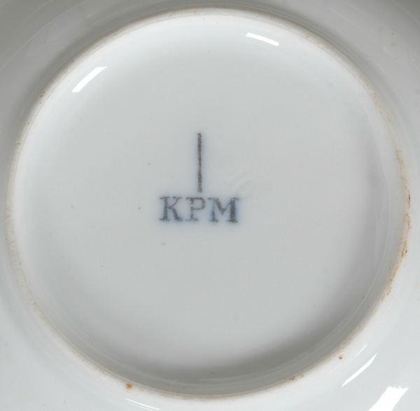 - Katalog-Nr: 1918Gedenktasse mit Unterschale. Berlin 1919. Porzellan, bunt bemalt, gold gehöht; und beschriftet: „Meiner lieben Frau Lisette Toussaint zur goldenen Hochzeit gewidmet Berlin 28.10.19 Emil Zerbst“; am Boden unterglasurblaue Szeptermarke mit EK.o.L.