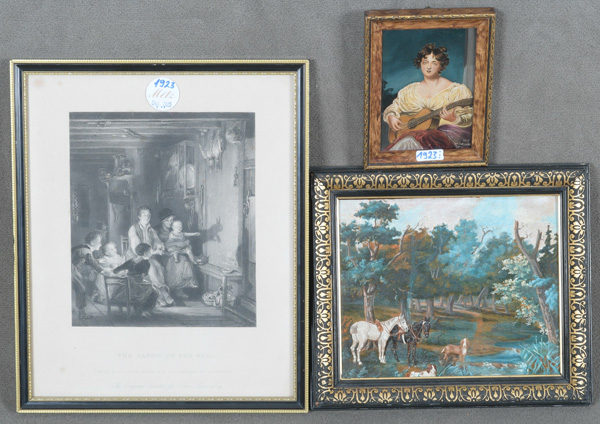 - Katalog-Nr: 1923Felix Windhager (Maler des 20. Jhs.). Dame beim Gitarrenspiel. Öl/Holz, aufgezogen, re./u./sign./dat. 1915, gerahmt, 12,0 x 8,5 cm; dazu Maler des 19. Jhs. Pferde und Hunde in Landschaft. Öl/Holz, li./u./monogr. „BS“, gerahmt, 14,5 x 21,5 cm; David Wilie (1785-1841). „The Rabbit on the wall“. Stich, mittig/u./sign., 20 x 17 cm.o.L.