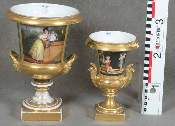 - Katalog-Nr: 1924Zwei Kratervasen. Frankreich 19. Jh. Porzellan, bunt bemalt mit Mutter und Kind bzw. Puttenszene, teilw. gold gehöht und poliert; ohne Marke, H=25 / 32 cm.o.L.