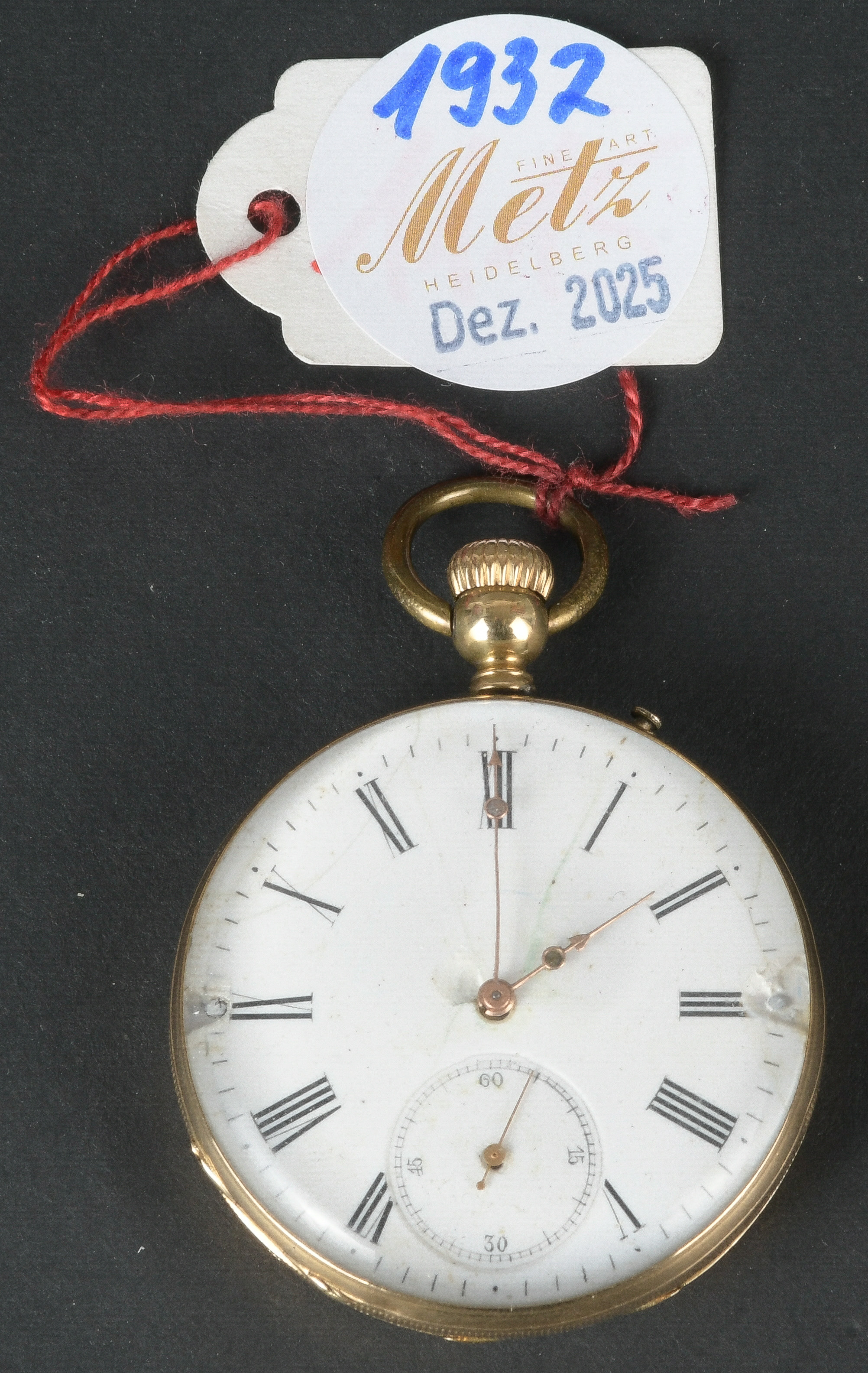 - Katalog-Nr: 1932Taschenuhr. 18 kt Gold, mit einem Deckel und Sekundenanzeige. (Funktion ungeprüft / Zifferblatt besch.)o.L.