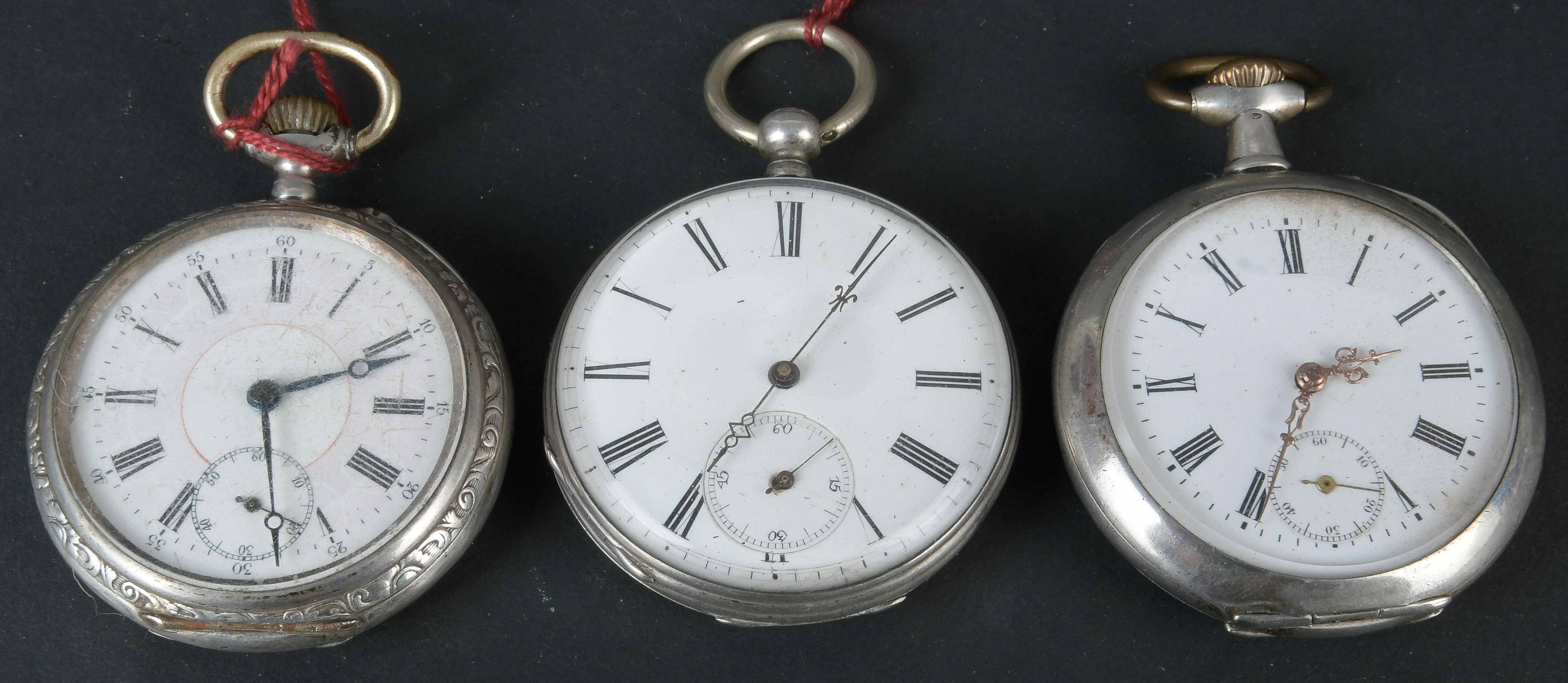 - Katalog-Nr: 1933Drei Taschenuhren u.a. „Helios“, „Demontor“. Silber, je mit Sekundenanzeige. (Funktion ungeprüft)o.L.