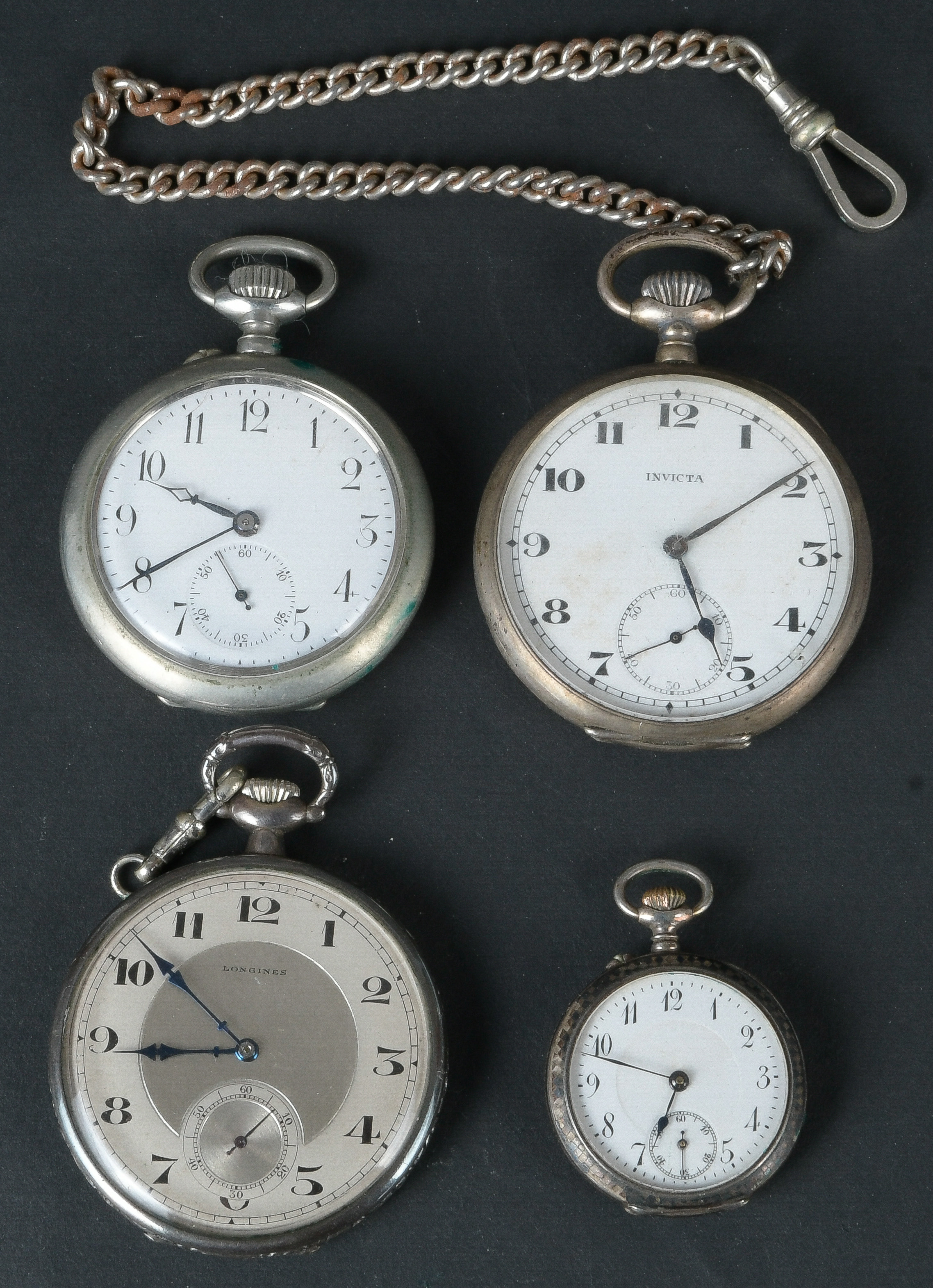 - Katalog-Nr: 1945Vier Taschenuhren, u.a. „Invicta“, „Longines“, „Moeris“. Teilw. Silber. (Funktion ungeprüft)o.L.