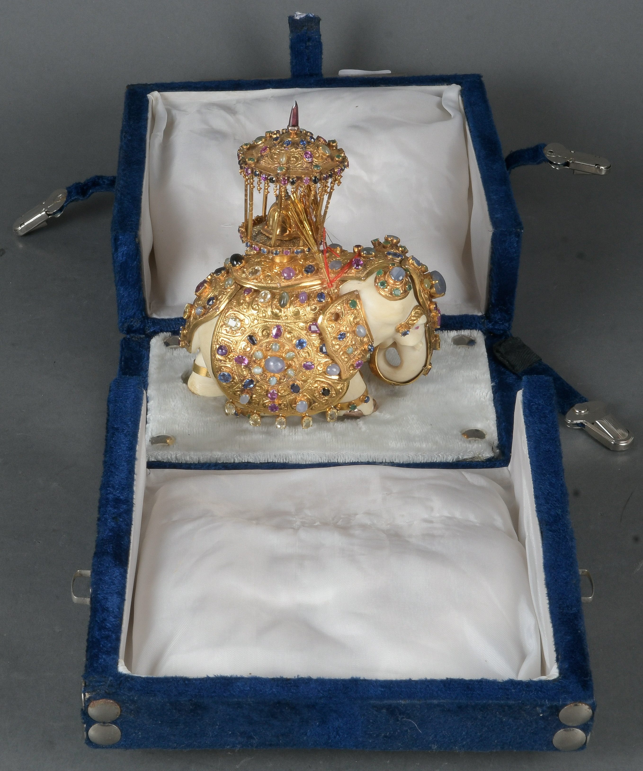 - Katalog-Nr: 1951Prunkelefant im Etui. Wohl Sri Lanka 19. Jh. Meisterhaft geschnitzt, mit 916er Gelbgoldrüstung und Baldachinaufsatz; dieser reich besetzt mit zahlreichen Edel- und Halbedelsteinen wie Achat, Citrin, Mondstein, Saphir, Smaragd, synth. Rubin, Sternsaphir/ -rubin, Quartz-Katzenauge, Topas und Turmalin in unterschiedlichen Schliffen, Gesamtgewicht ca. 373 g, H=12,5 cm, L=13 cm, T=6 cm.o.L.