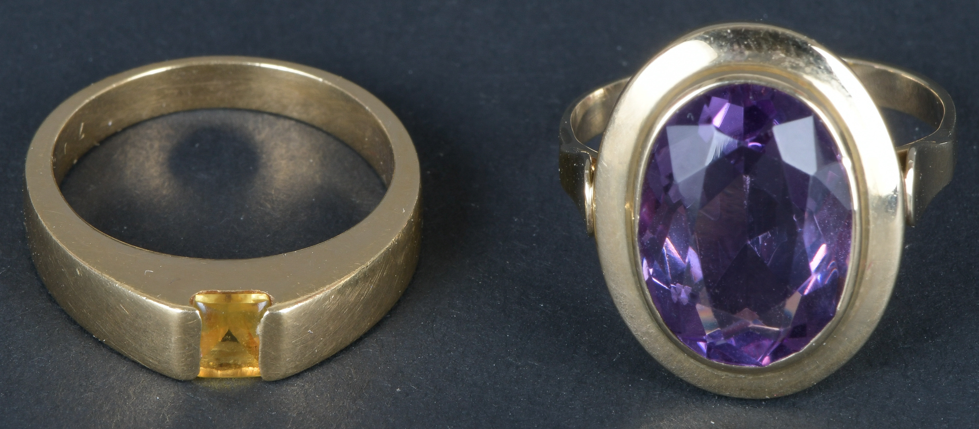 - Katalog-Nr: 1960Zwei Damenringe. 14 kt Gold, besetzt mit Amethyst / Citrin, Gesamtgewicht ca. 9,71 g, Ringgröße 53 / 59.o.L.