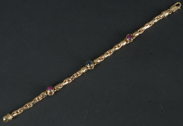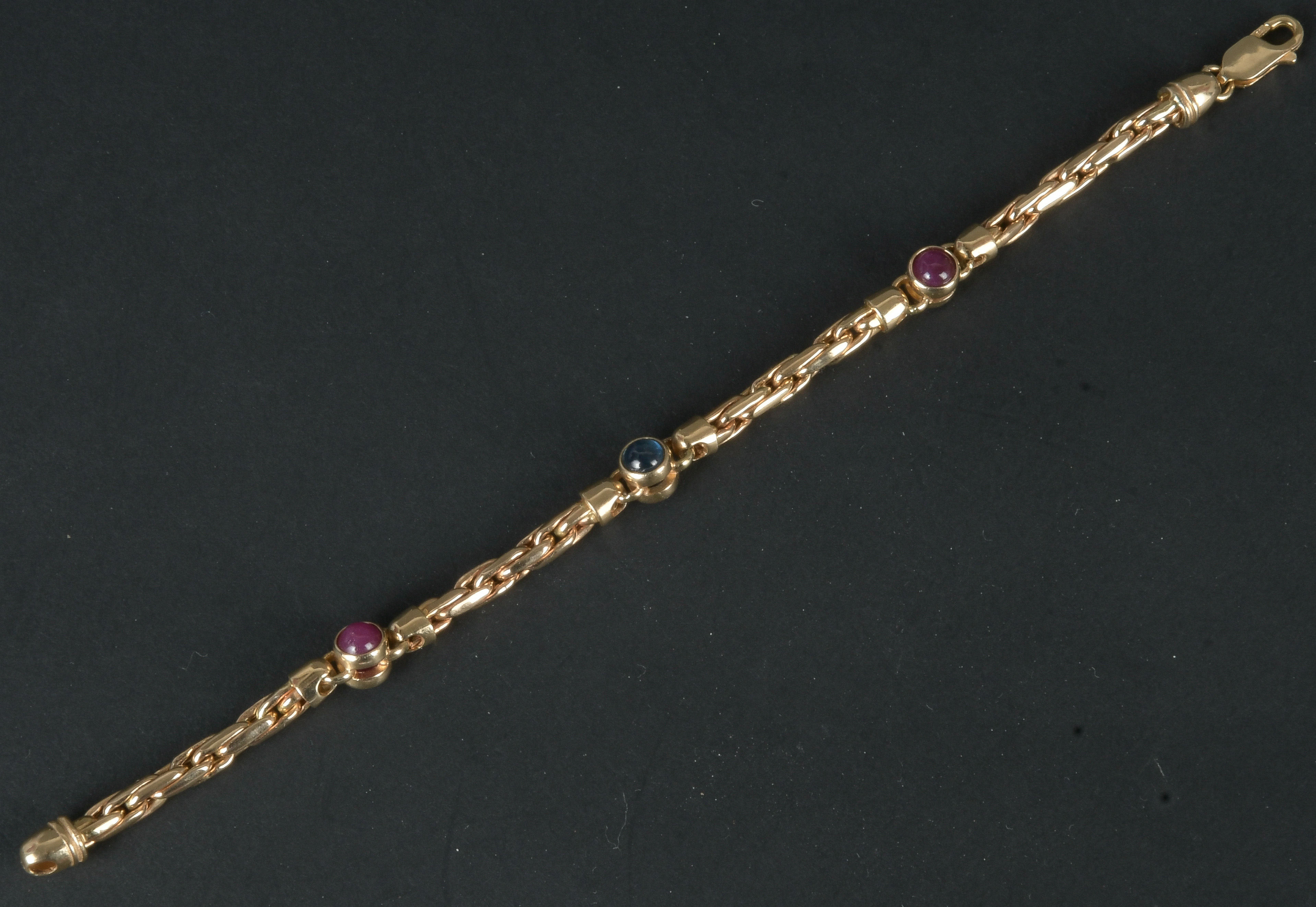 - Katalog-Nr: 1974Gliederarmband. 14 kt Gold, besetzt mit rubin und saphirfarbigen Steinen, Gesamtgewicht ca. 14,32 g, L=19 cm.o.L.