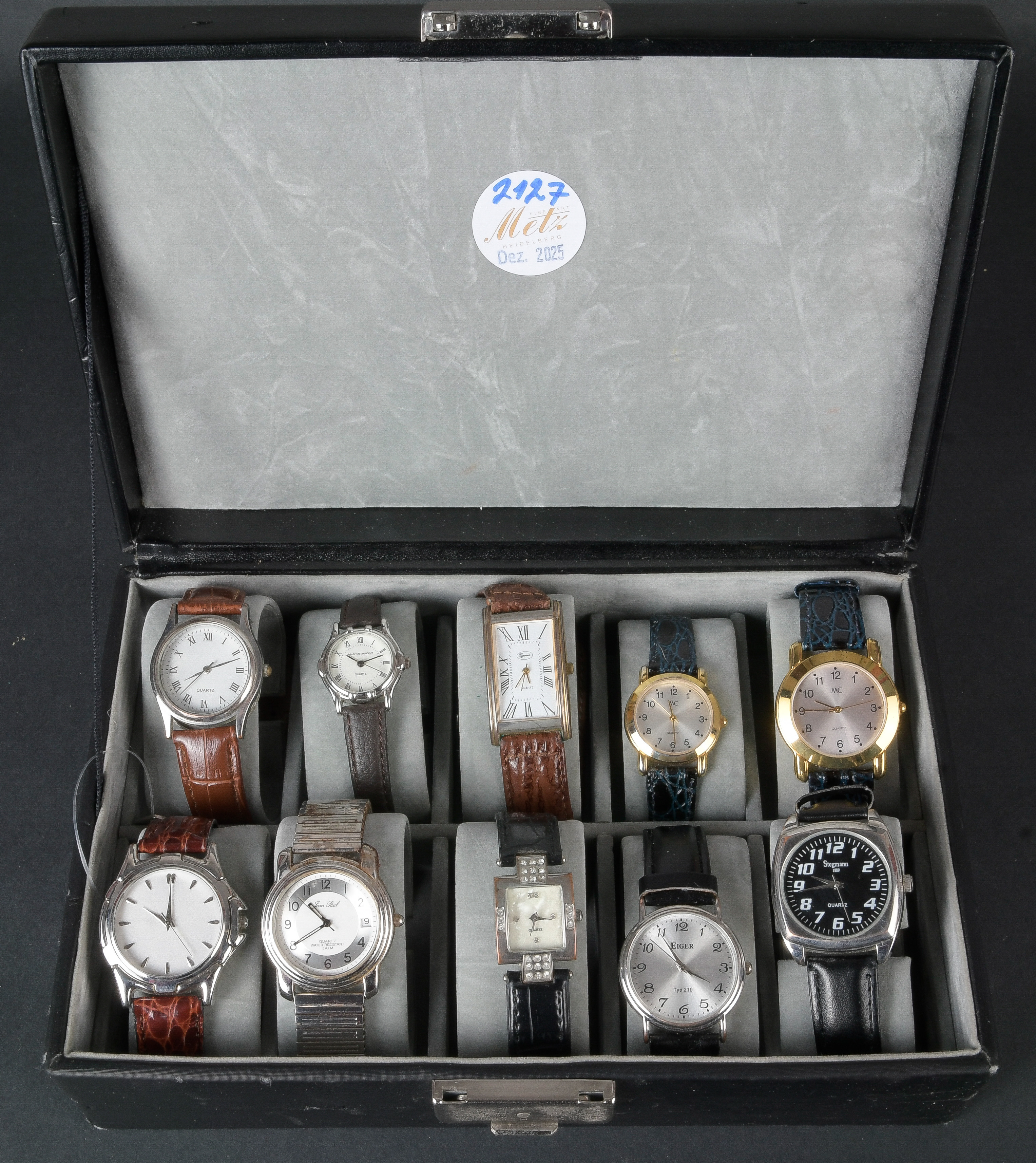 - Katalog-Nr: 2127Konvolut Herren- und Damenarmbanduhren, u.a. „Amyvermont“, „Cypréa“, „Eiger“ und „Jean Paul“ im Etui. (Funktion ungeprüft)o.L.