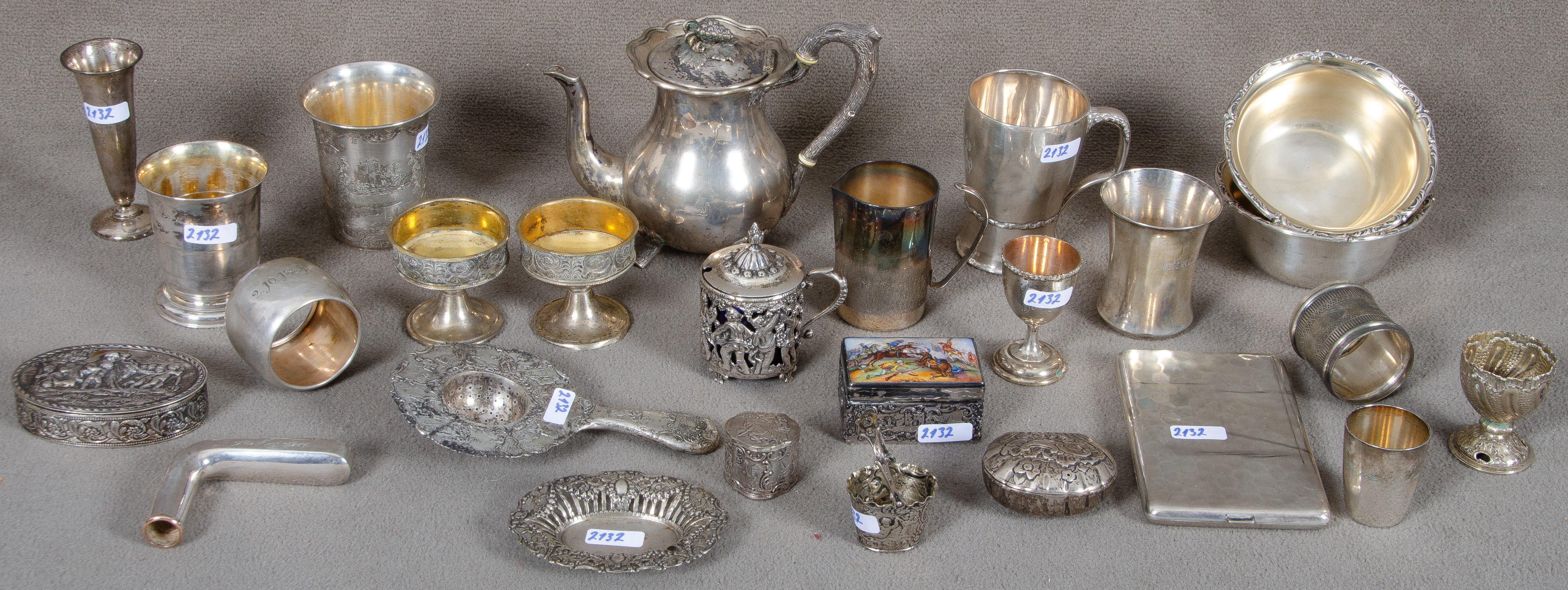 - Katalog-Nr: 2132Konvolut Silber, ca. 1.300 g, u.a. Becher, Deckeldosen, Eierbecher, Etui, Gewürzgefäß, Kanne, Schalen, Sieb und Vasen, H=1 bis 13,5 cm.o.L.