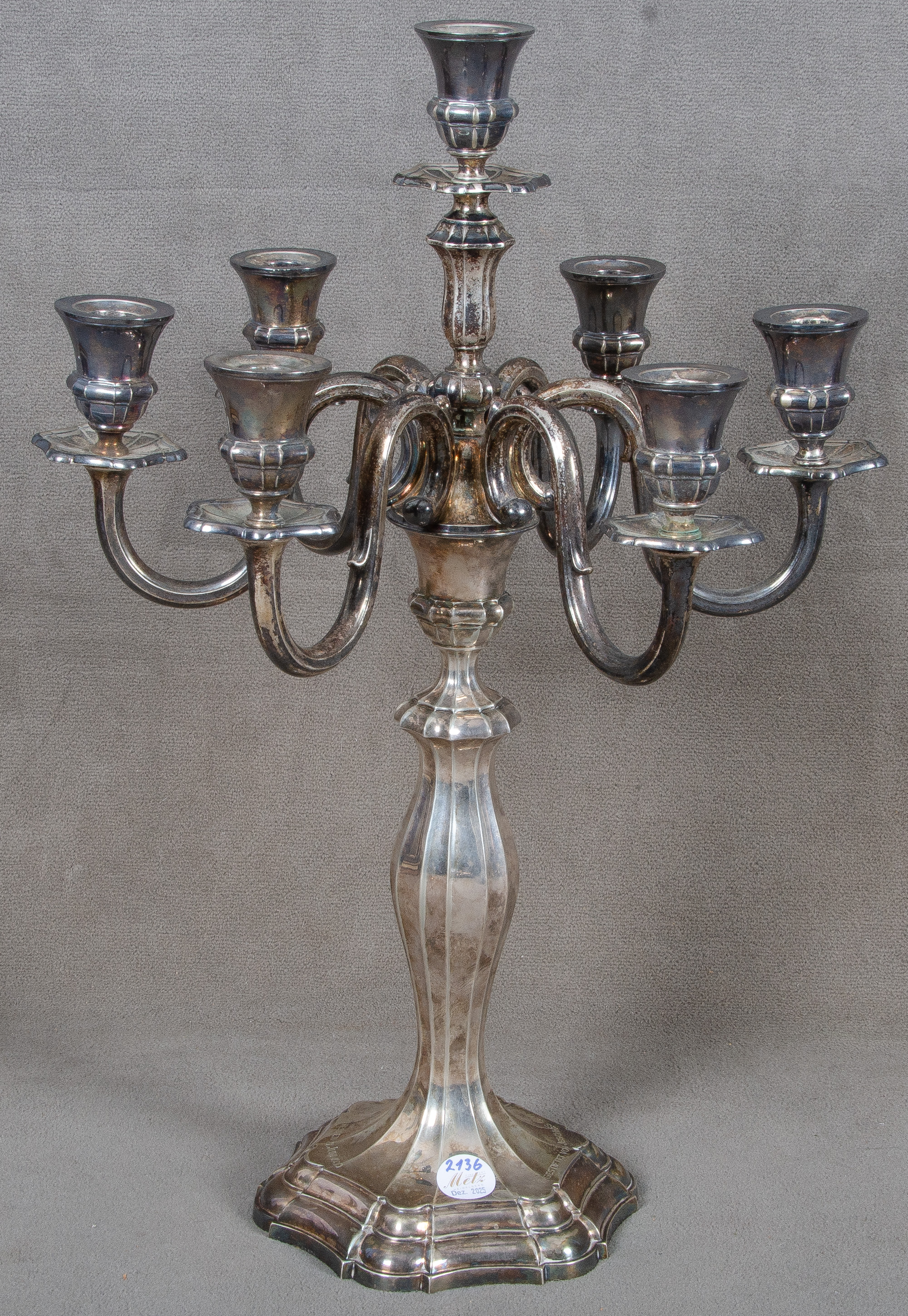 - Katalog-Nr: 2136Siebenflammige Girandole. Deutsch 20. Jh. Silber, ca. 2.200 g, H=61,5 cm, D=42 cm.o.L.
