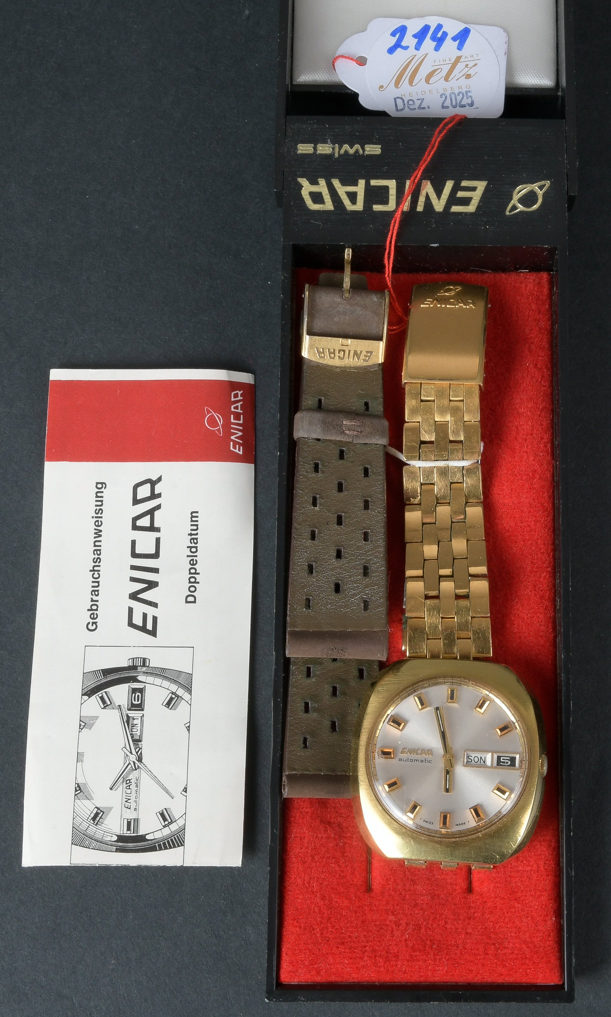 - Katalog-Nr: 2141Herrenarmbanduhr „Enicar“, mit Gebrauchsanweisung und Ersatzarmband. (Funktion ungeprüft)o.L.