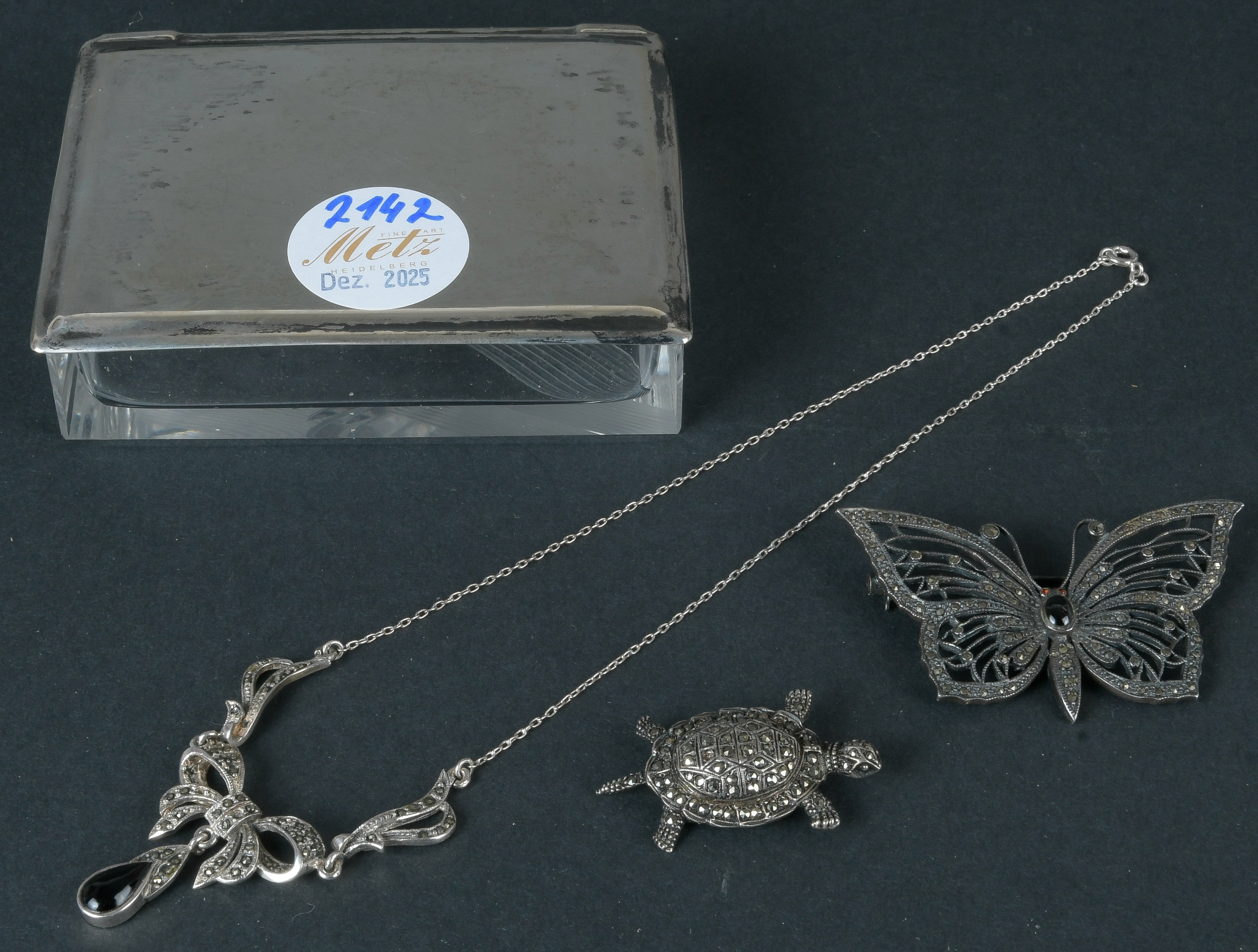 - Katalog-Nr: 2142Schmetterlings- und Schildkröten-Brosche sowie Collier. Silber, ca. 40 g; dazu Dose mit Silberdeckel.o.L.