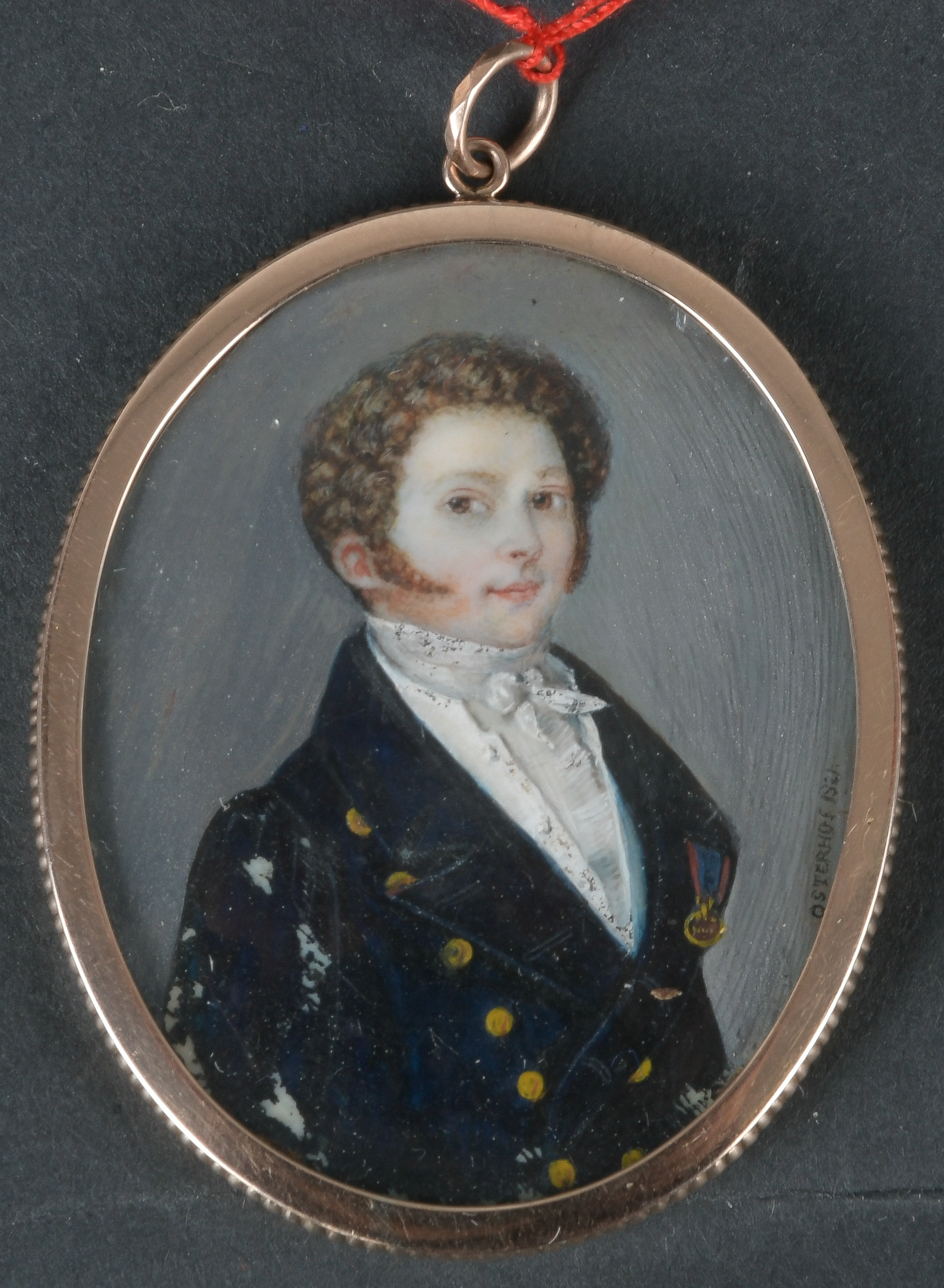 - Katalog-Nr: 2143Osterhof (Miniaturist des 18./19. Jhs.). Herrenporträt, re./mittig/sign./dat. 1821, in 14 kt Goldrahmen, 6 x 4,5 cm.o.L.