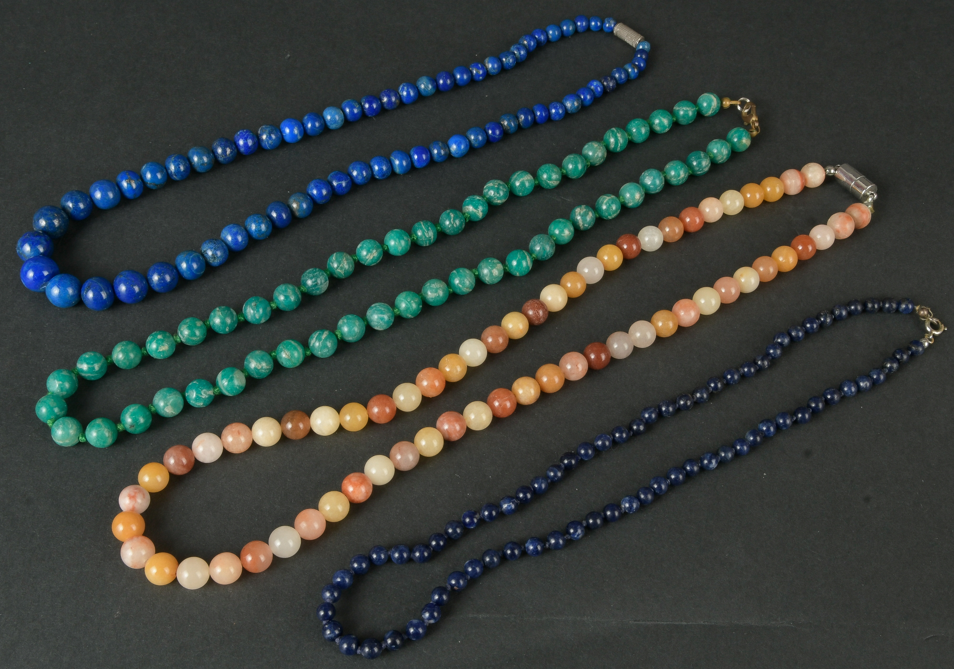- Katalog-Nr: 2146Vier Halsketten mit Jade-, Lapislazuli- und Türkiskugeln, L=40 bis 50 cm.o.L.