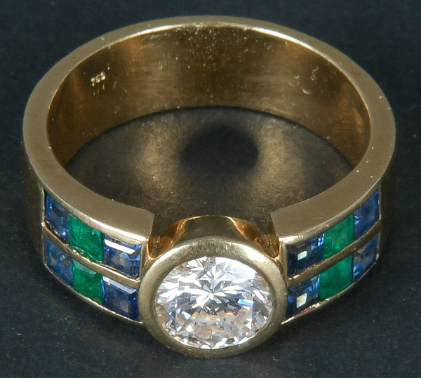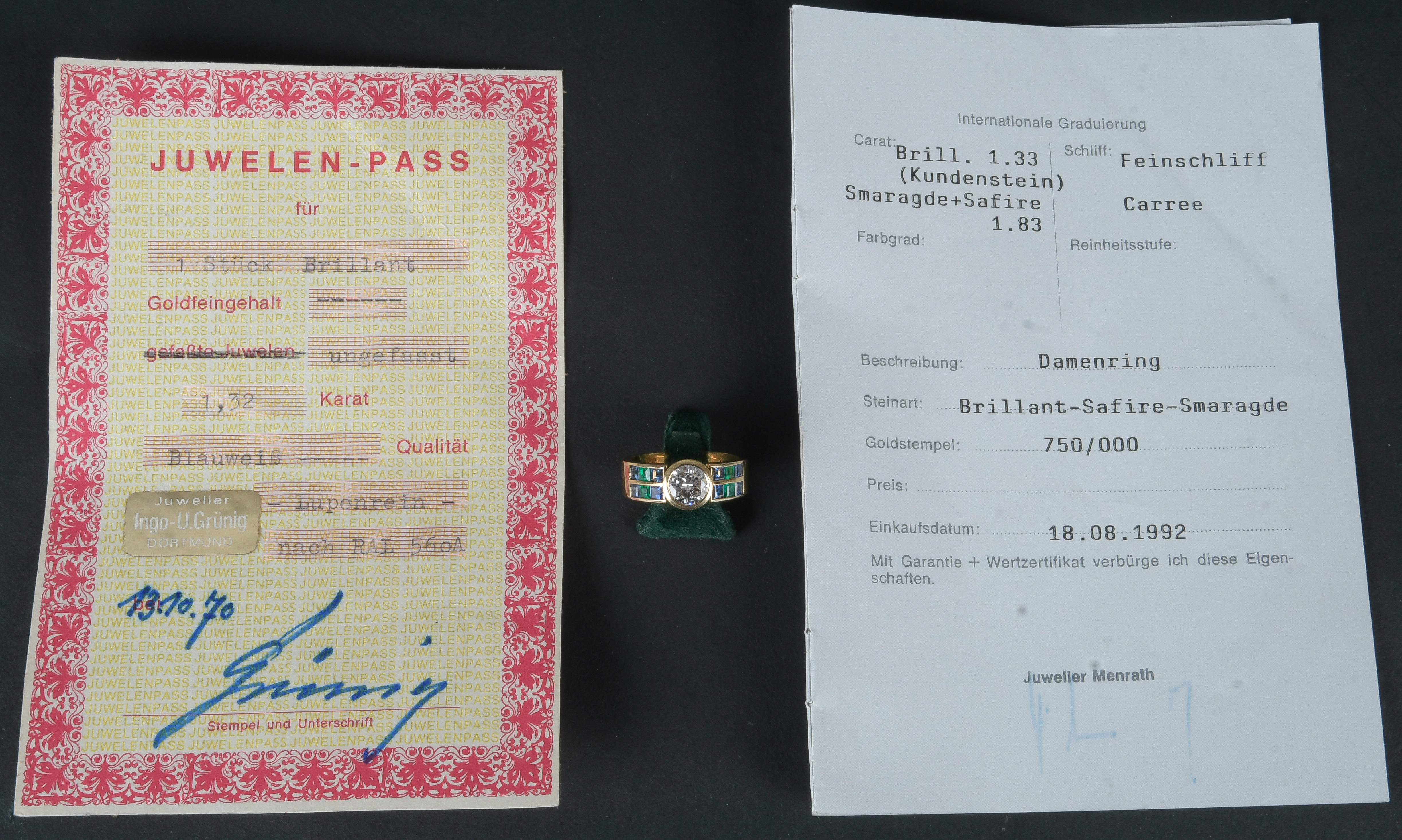 - Katalog-Nr: 2149Damenring. 18 kt Gold, besetzt mit Brillant, ca. 1,33 ct, Saphir und Smaragd, Gesamtgewicht ca. 8,86 g, Ringgröße 58. Mit Schmuckpass von Juwelier Menrath 1992.o.L.