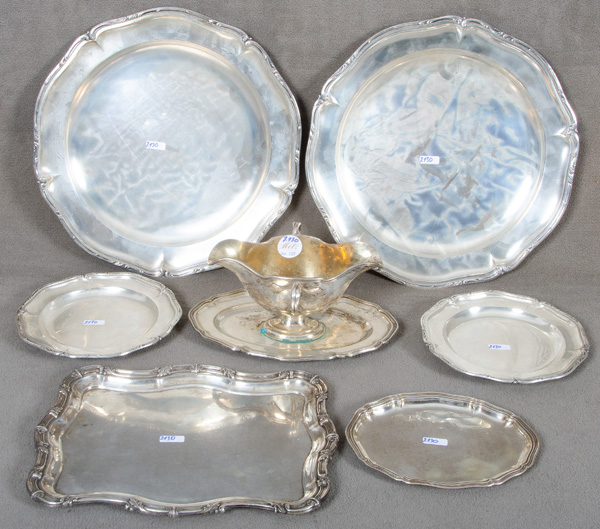 - Katalog-Nr: 2130Konvolut Silber, ca. 3.000 g, u.a. Saucière, Tabletts und Teller, H=1 bis 11 cm, D=15,5 bis 34 cm.o.L.