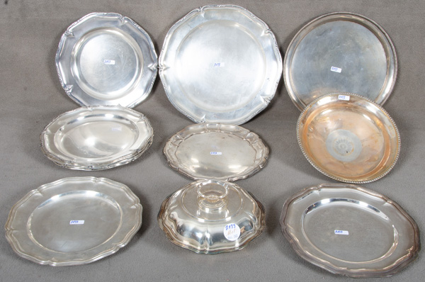 - Katalog-Nr: 2133Konvolut Silber, ca. 3.900 g / Versilbertes, u.a. Aufsatz, Kasserolle, Platten und Teller, H=1 bis 11 cm, D=19 bis 25 cm.o.L.