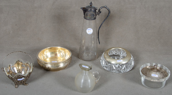 - Katalog-Nr: 2134Konvolut Silber, ca. 280 g / Versilbertes, u.a. Deckeldosen, Gewürzkorb, Henkelkorb, Karaffe und Schalen, H=5,5 bis 30 cm, D=12 bis 16 cm.o.L.