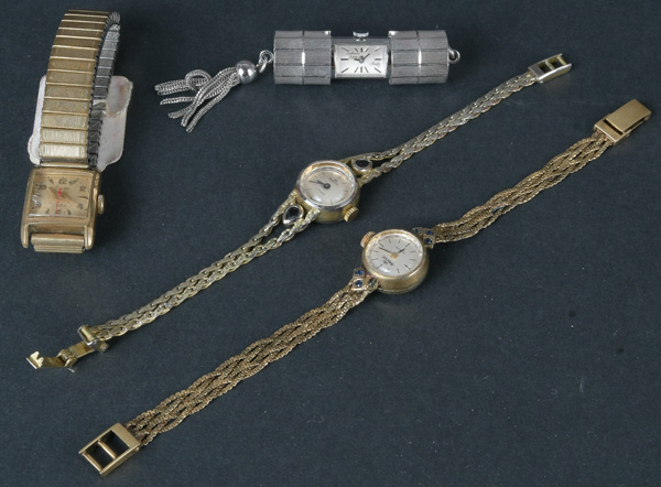 - Katalog-Nr: 2140Drei Damenarmbanduhren: „Majestic“, „Pallas“ und „Stowa“; dazu ein Anhänger mit Uhr. Zwei Stück Silber. (Funktion ungeprüft)o.L.