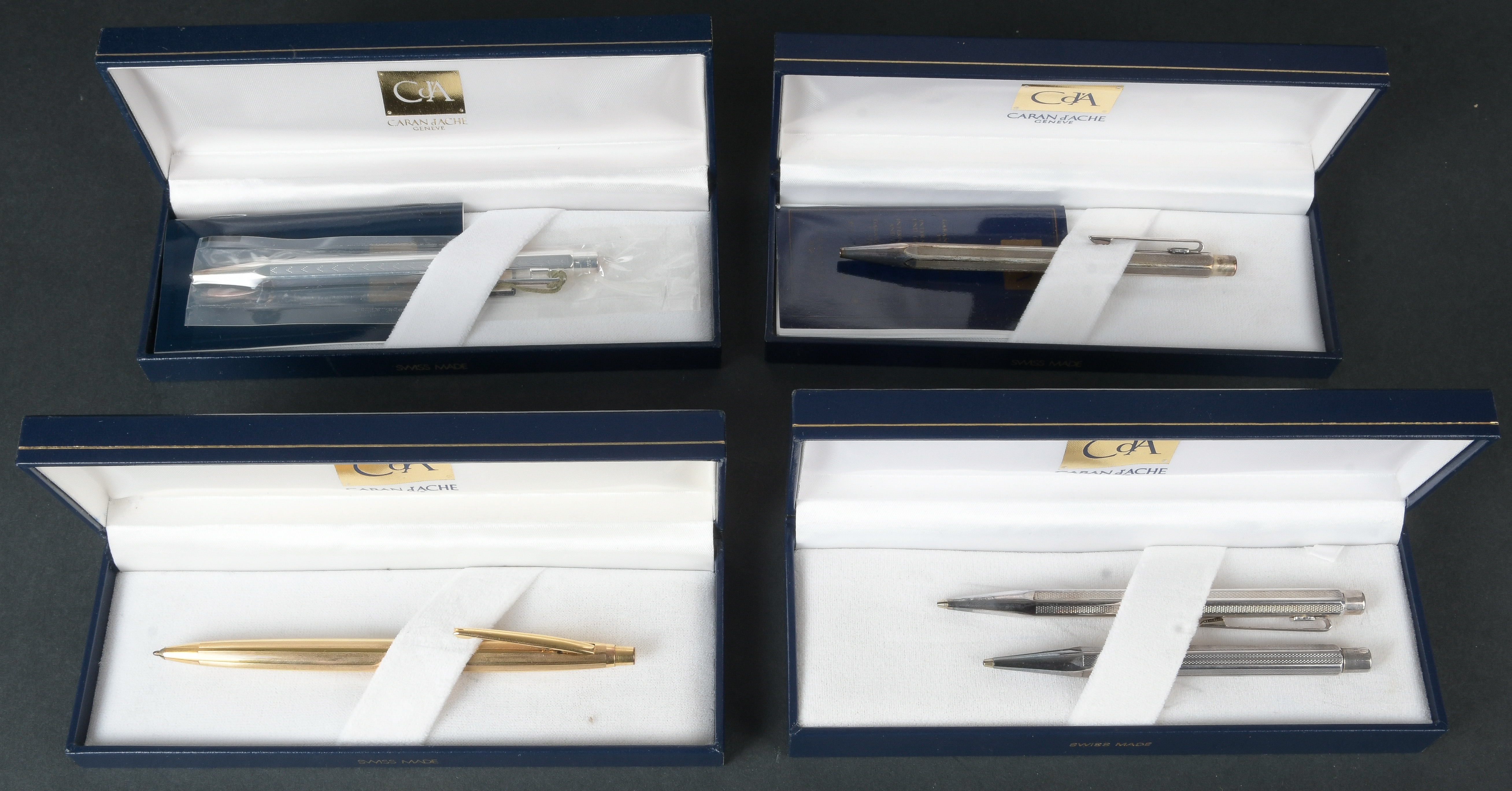 - Katalog-Nr: 2150Fünf Kugelschreiber. Genf, Caran d' Ache. Drei aus Silber, einer vergoldet und einer versilbert. (Funktion ungeprüft / einer besch.)o.L.