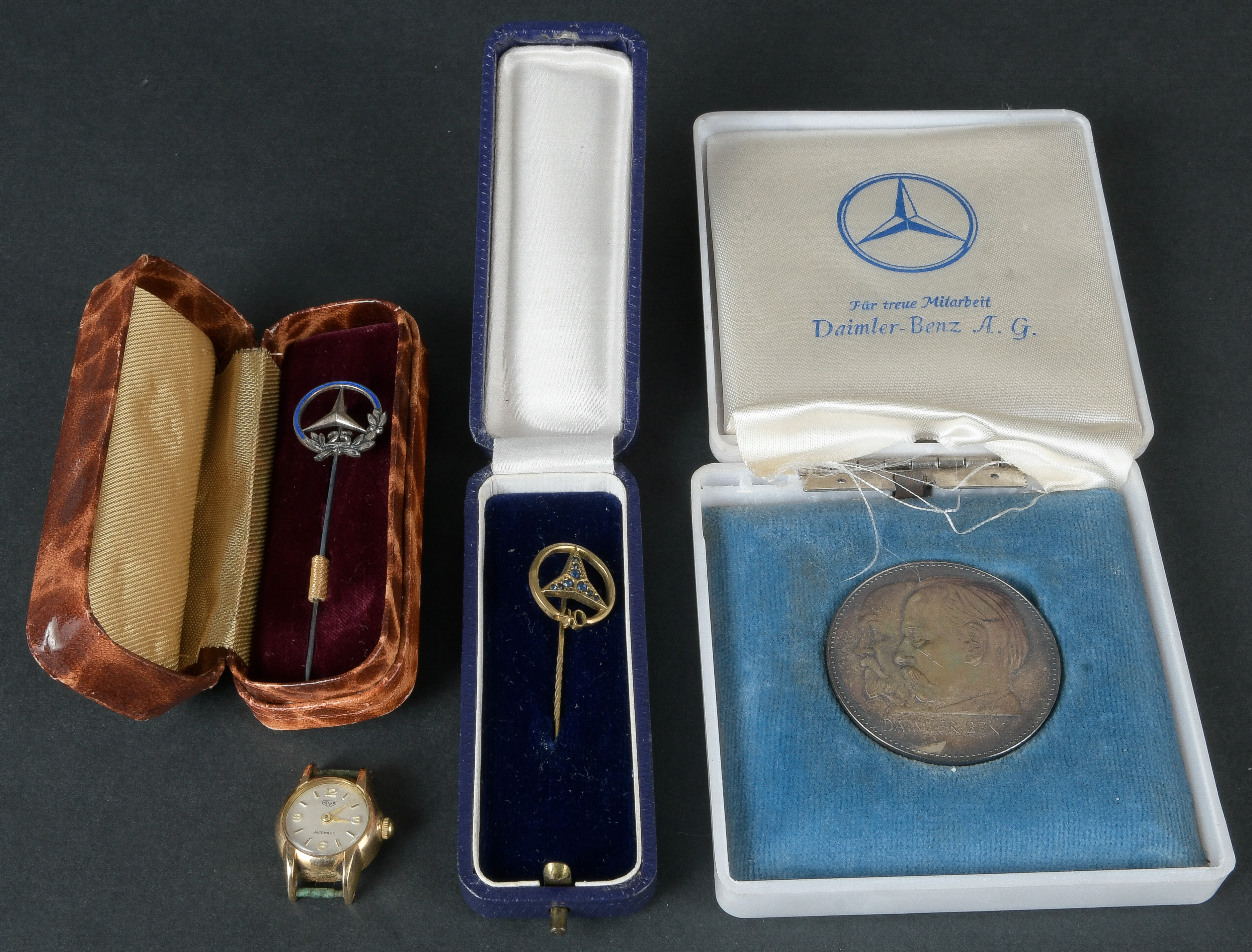 - Katalog-Nr: 2152Viertlgs. Konvolut: Ein Armbanduhrengehäuse „Heuer“, Silber (Funktion ungeprüft); eine Silbermünze „75 Jahre Mercedes Benz“; eine Silberanstecknadel, Gesamtgewicht ca. 27 g; und eine versilberte Anstecknadel.o.L.