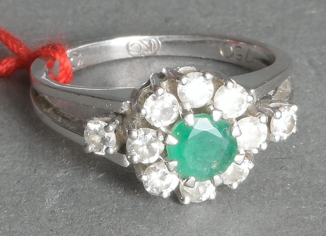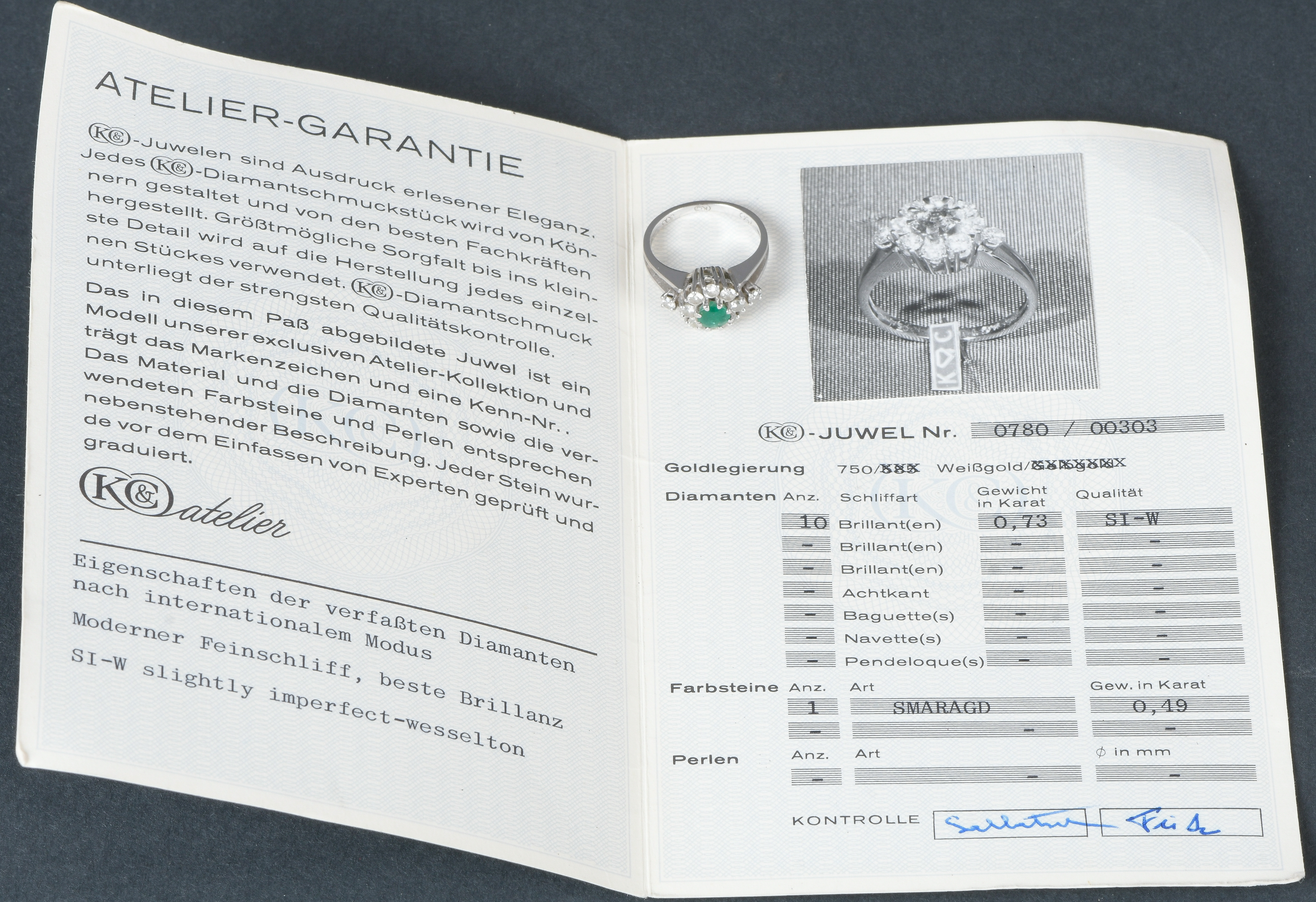 - Katalog-Nr: 2157Damenring. 18 kt Gold, besetzt mit Brillanten, ca. 0,73 ct, und Smaragd, ca. 0,49 ct, Gesamtgewicht ca. 4,74 g, Ringgröße 54. Mit Garantiekarte von H. Bräer, Hannover 1969.o.L.