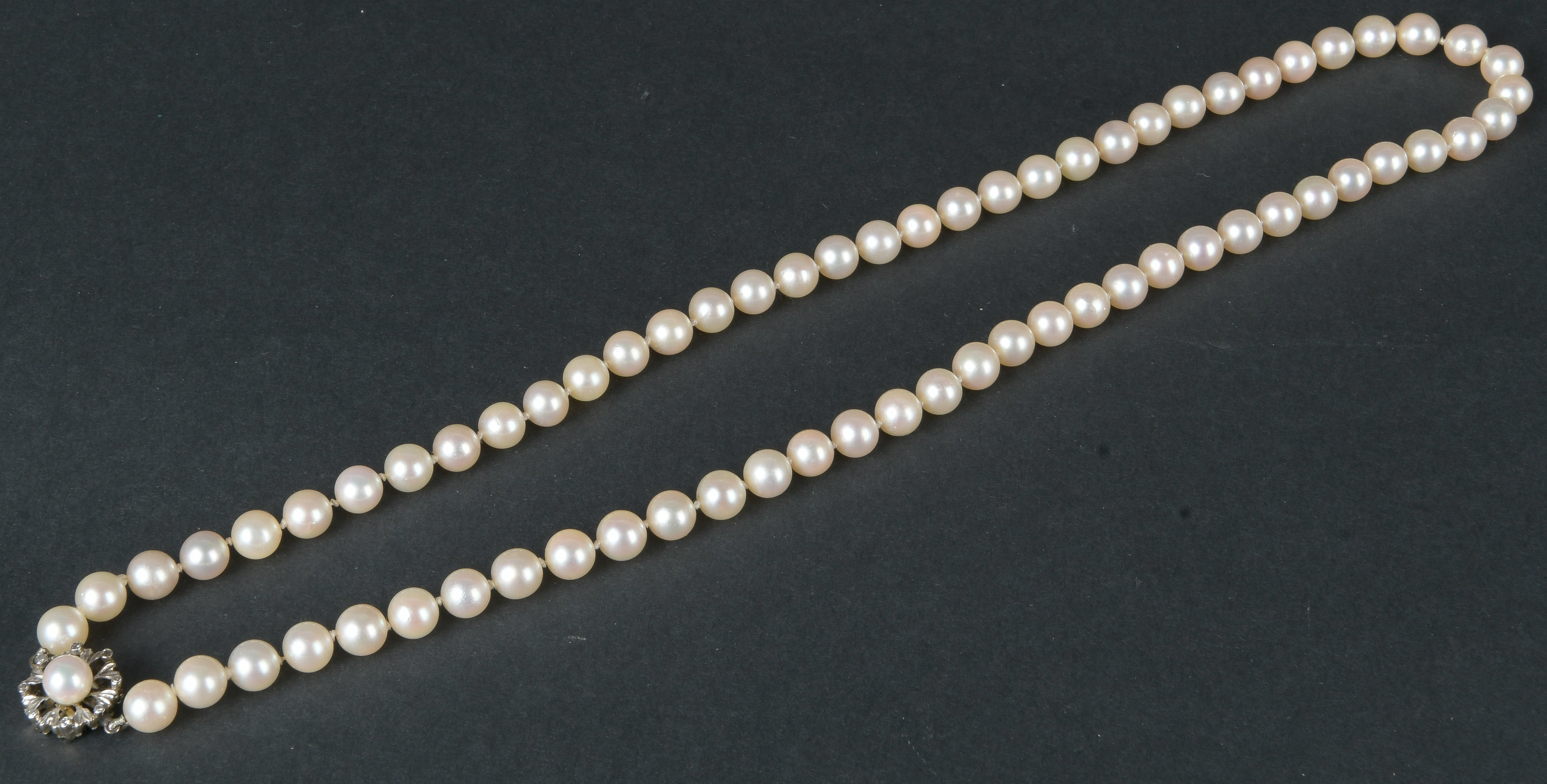 - Katalog-Nr: 2158Perlenkette mit 18 kt Goldverschluss, besetzt mit Brillant, ca. 0,07 ct, L=61 cm.o.L.