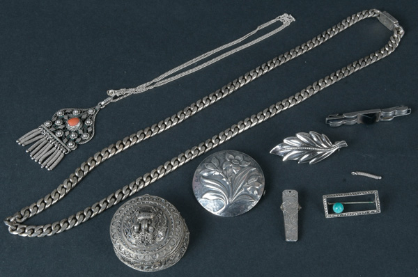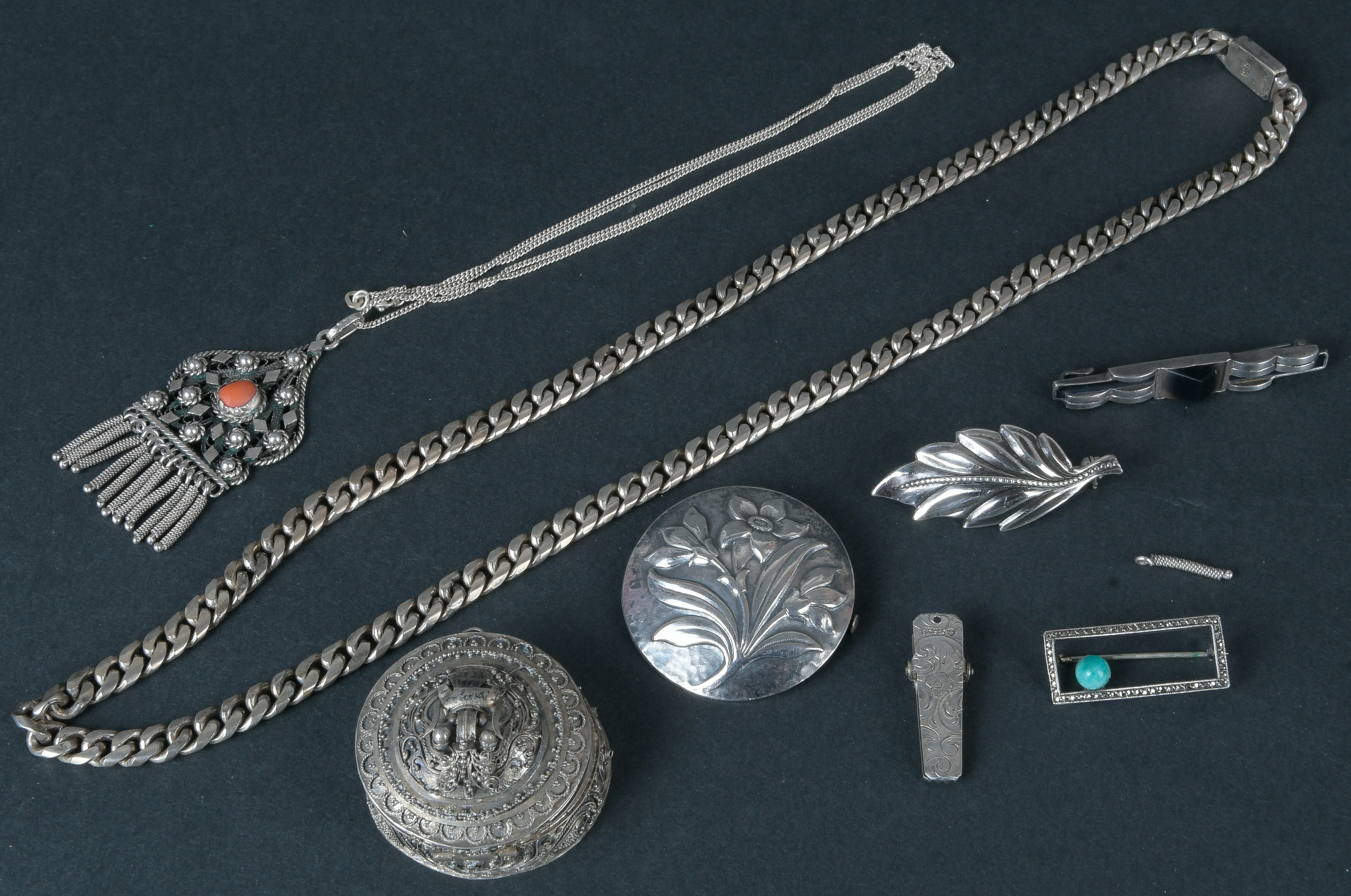 - Katalog-Nr: 2160Konvolut Silberschmuck, ca. 92,88 g, u.a. Anhänger, Broschen und Halsketten, teilw. besetzt mit Jade, Koralle und Türkis, L=54 bis 60 cm.o.L.