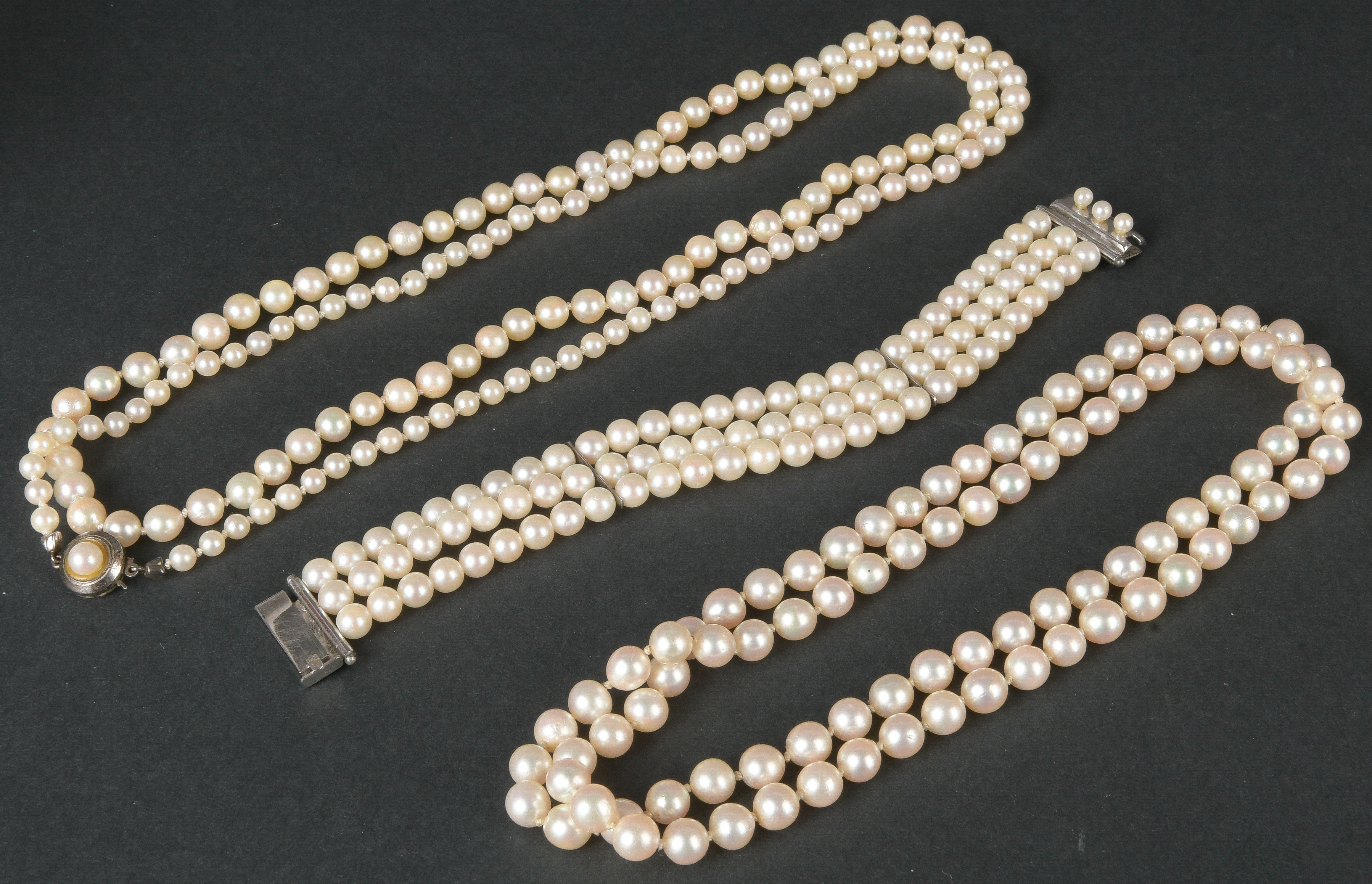 - Katalog-Nr: 2161Zwei Perlenhalsketten und ein -armband, zwei mit Silberverschluss, L=72 / 94 / 18 cm.o.L.
