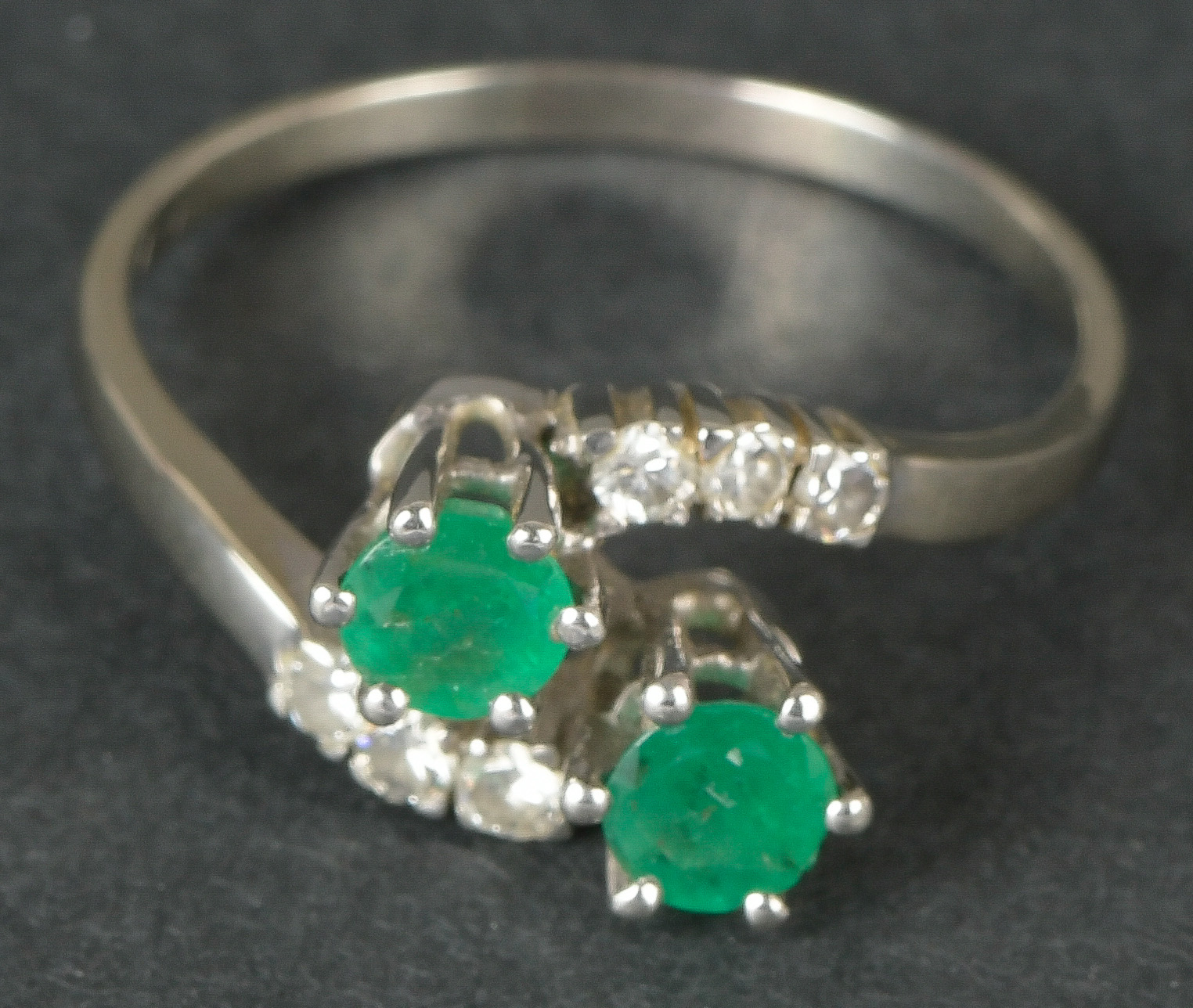 - Katalog-Nr: 2164Damenring. 18 kt Gold, besetzt mit Brillanten, ca. 0,10 ct, und zwei Smaragden, Gesamtgewicht ca. 2,97 g, Ringgröße 59.o.L.