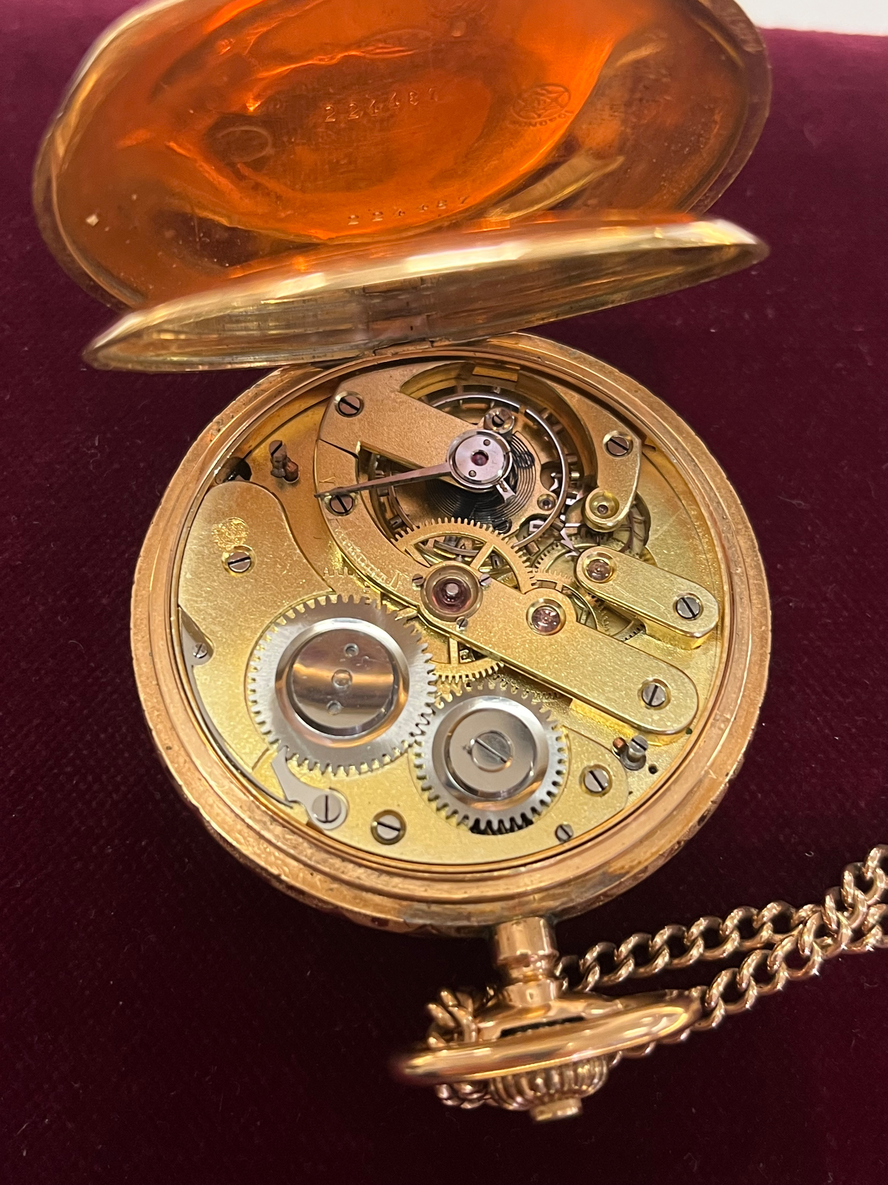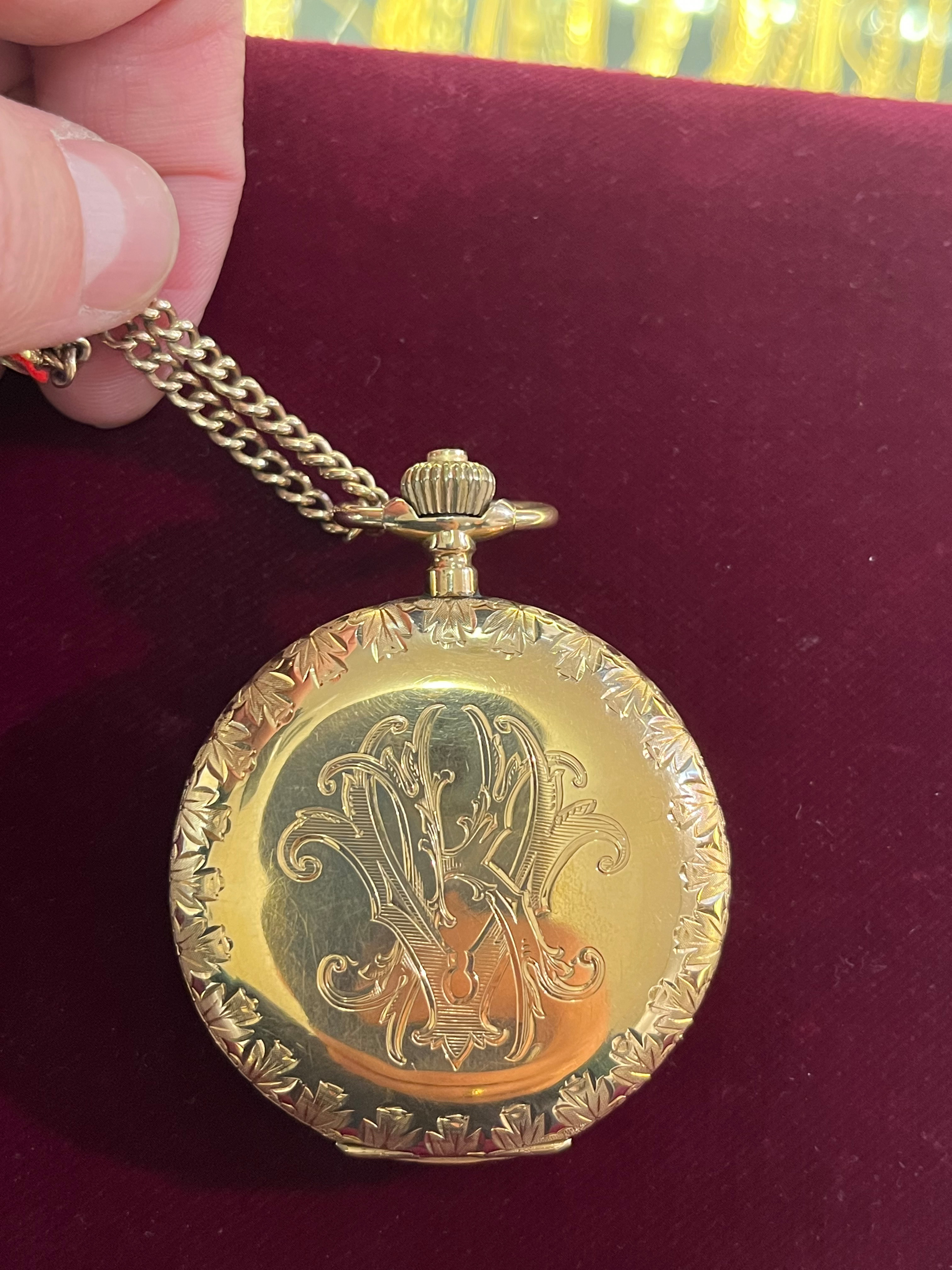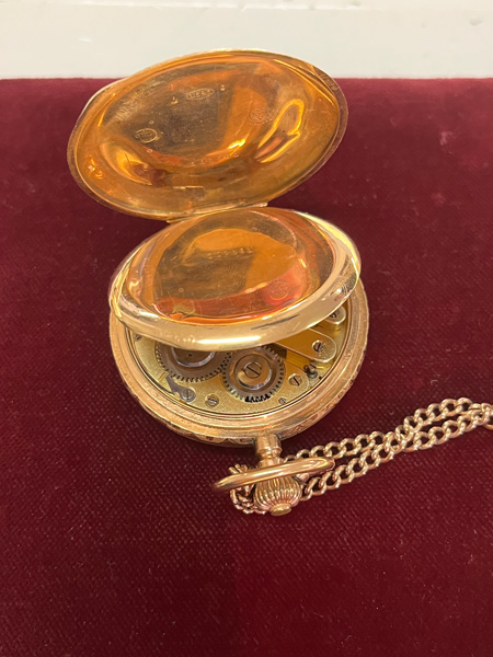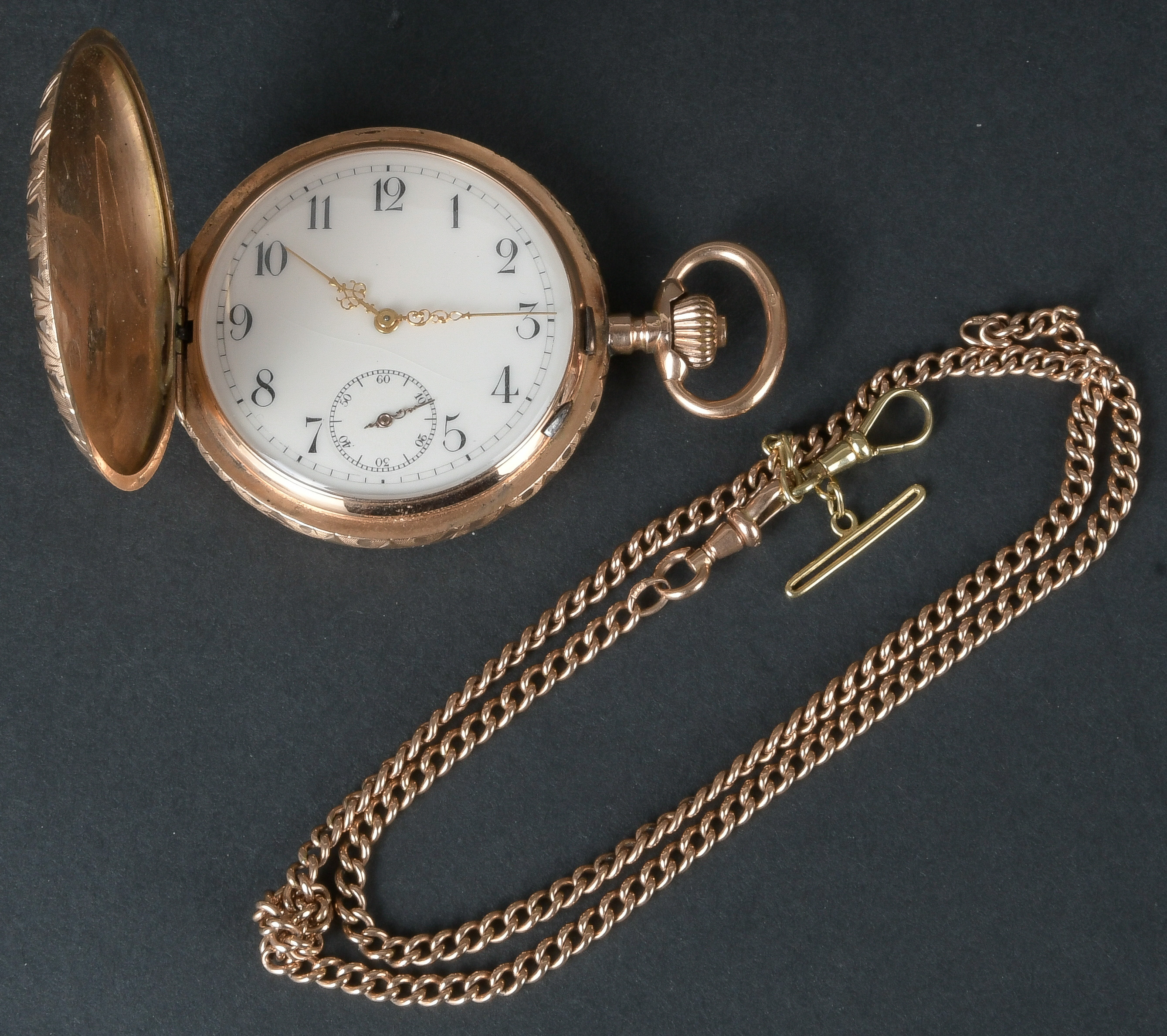 - Katalog-Nr: 2169Taschenuhr und Uhrenkette. Je 14 kt Gold, ca. 22,80 g. (Funktion ungeprüft)o.L.