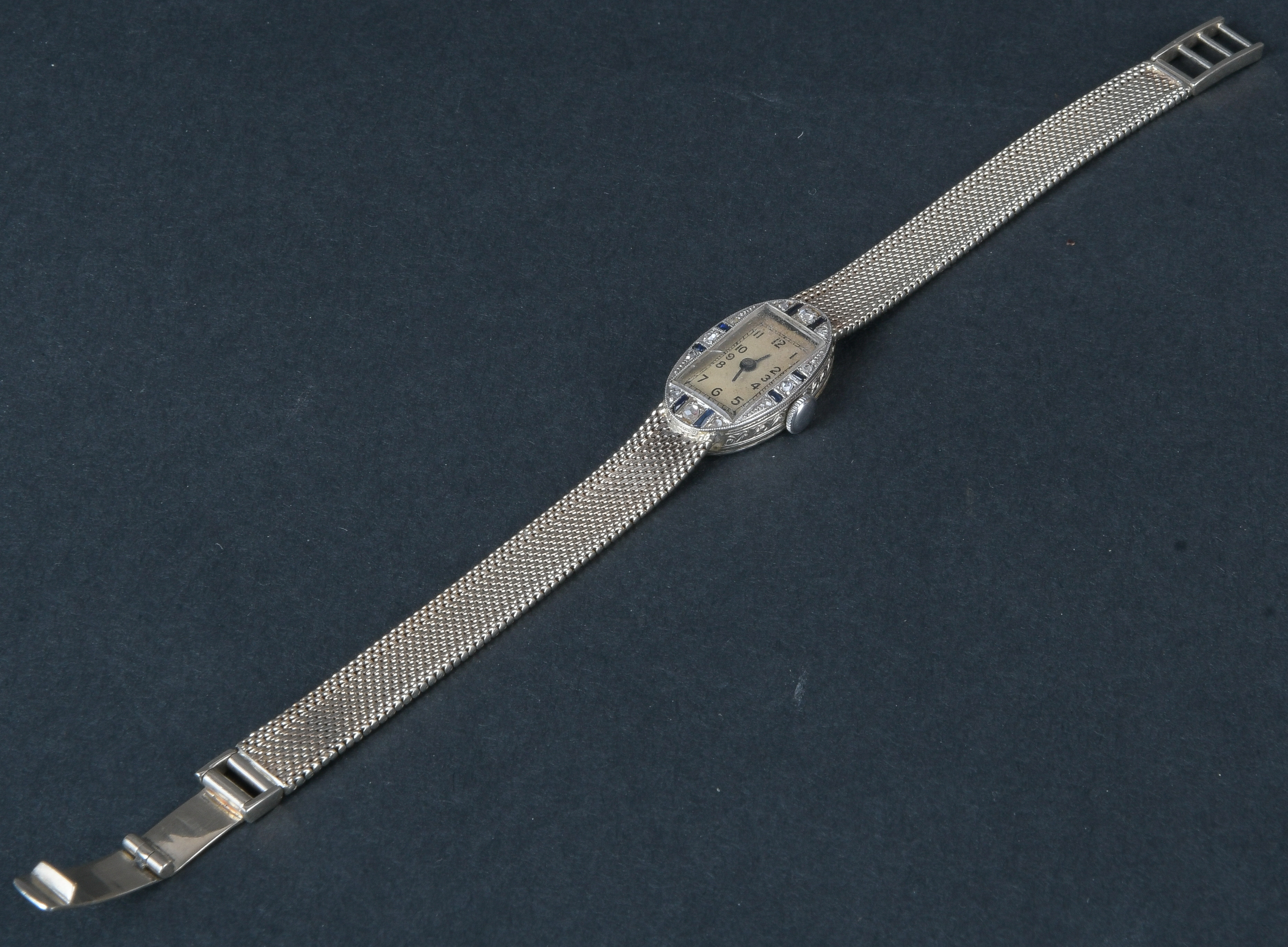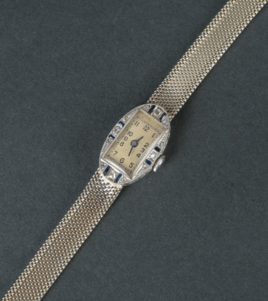- Katalog-Nr: 2170Damenarmbanduhr. 14 kt Gold, besetzt mit Brillanten, ca. 0,15 g, und Saphiren. (Funktion ungeprüft)o.L.