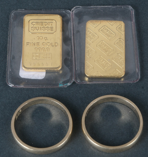- Katalog-Nr: 2151Zwei Feingoldbarren, ca. 20 g, und zwei Ringe, 14 kt Gold, ca. 7,92 g, Ringgröße 63.o.L.
