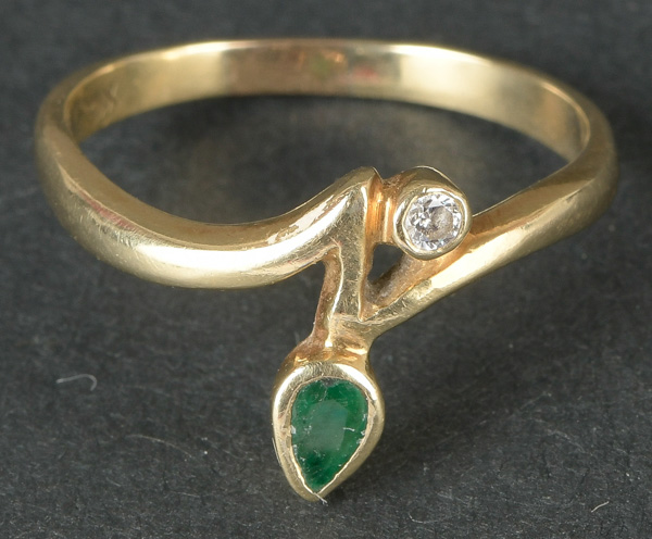 - Katalog-Nr: 2165Damenring. 14 kt Gold, besetzt mit Brillant, ca. 0,02 ct, und Smaragd, Gesamtgewicht ca. 2,47 g, Ringgröße 59.o.L.