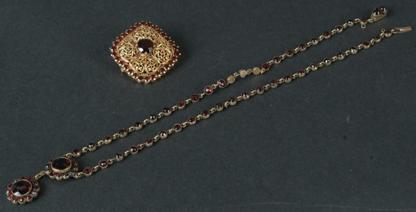- Katalog-Nr: 2171Brosche, 18 kt Gold, ca. 8,75 g, und Collier, vergoldet, teilw. besetzt mit Granaten, L=37 cm.o.L.