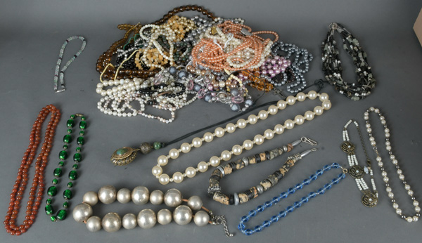 - Katalog-Nr: 2173Konvolut Modeschmuck, u.a. Halsketten mit Steinbesatz und Kunstperlenketten, L=40 bis 70 cm.o.L.