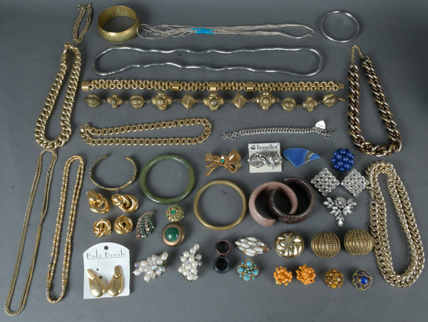- Katalog-Nr: 2174Konvolut Modeschmuck, u.a. Armbänder, Broschen, Halsketten, Ohrclips und Ringe. Versilbert / vergoldet, mit Steinbesatz, L=20 bis 104 cm.o.L.