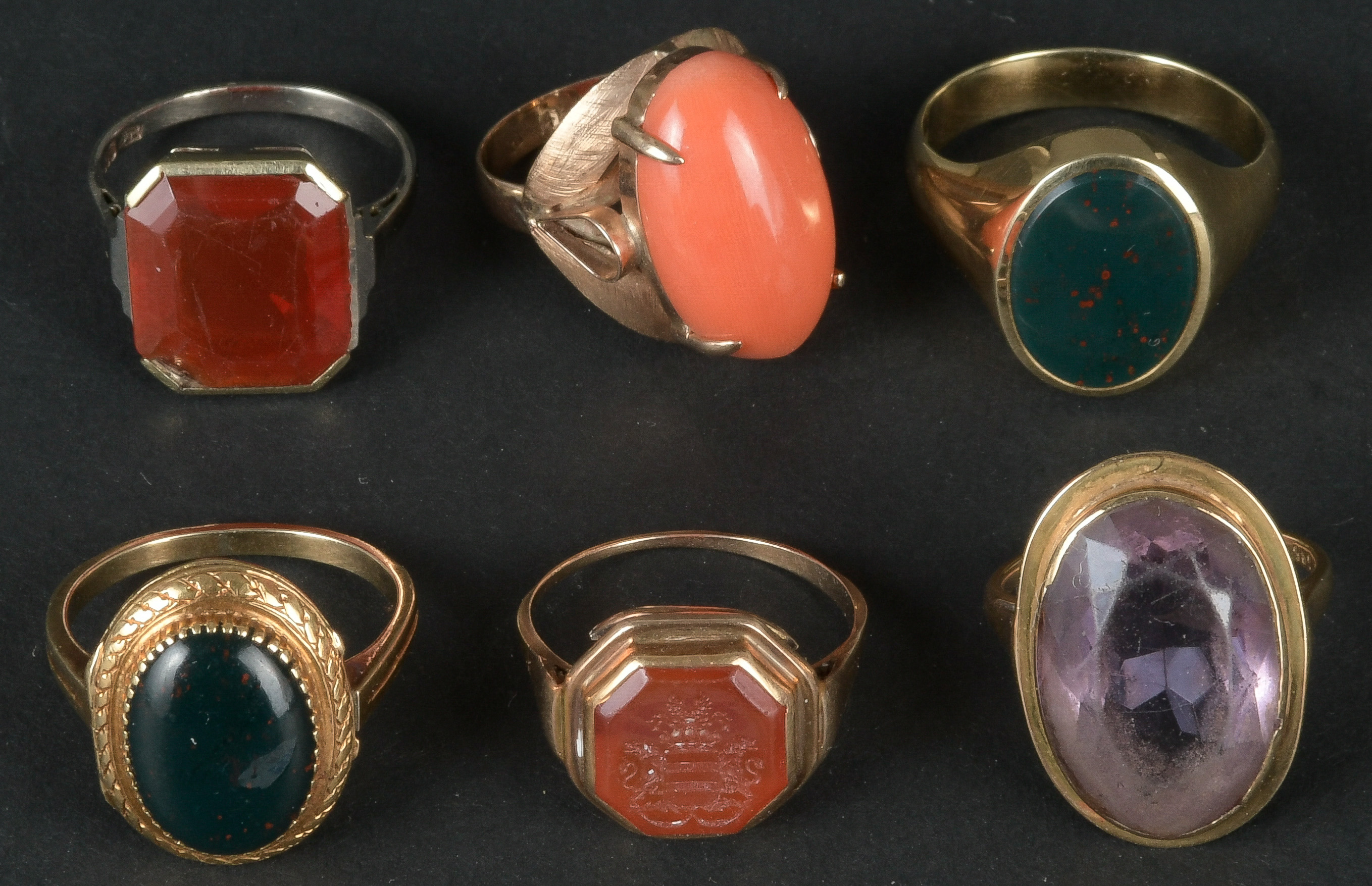 - Katalog-Nr: 2228Sechs Ringe. 14 kt Gold, besetzt mit amethyst, jaspis-, karneol, koralle- und onyxfarbigen Steinen, Gesamtgewicht ca. 30,83 g, Ringgröße 48 bis 62.o.L.
