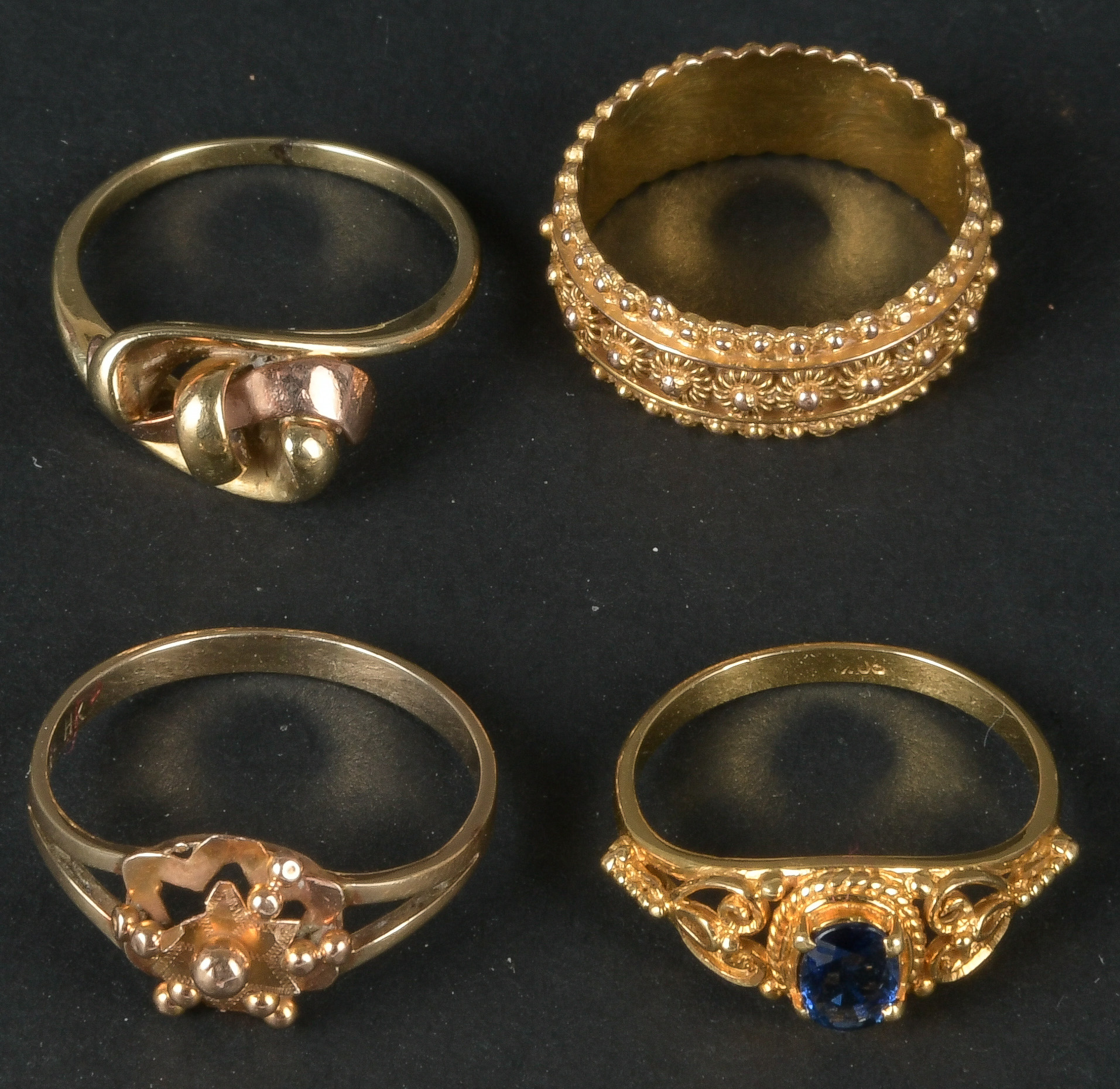 - Katalog-Nr: 2231Vier Damenringe. 14 kt Gold, einer besetzt mit saphirfarbigem Stein, Gesamtgewicht ca. 12,89 g, Ringgröße 55 bis 59.o.L.