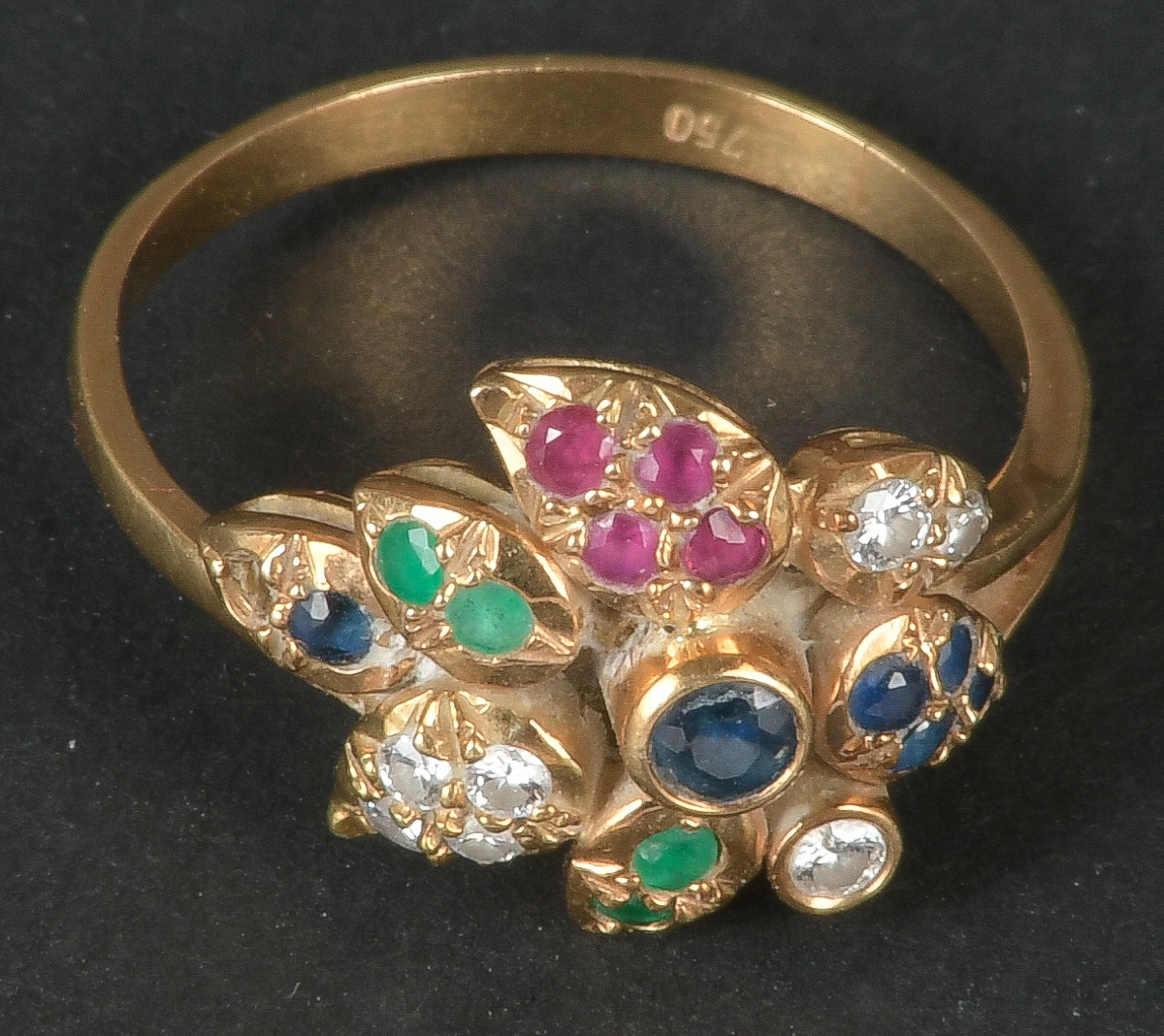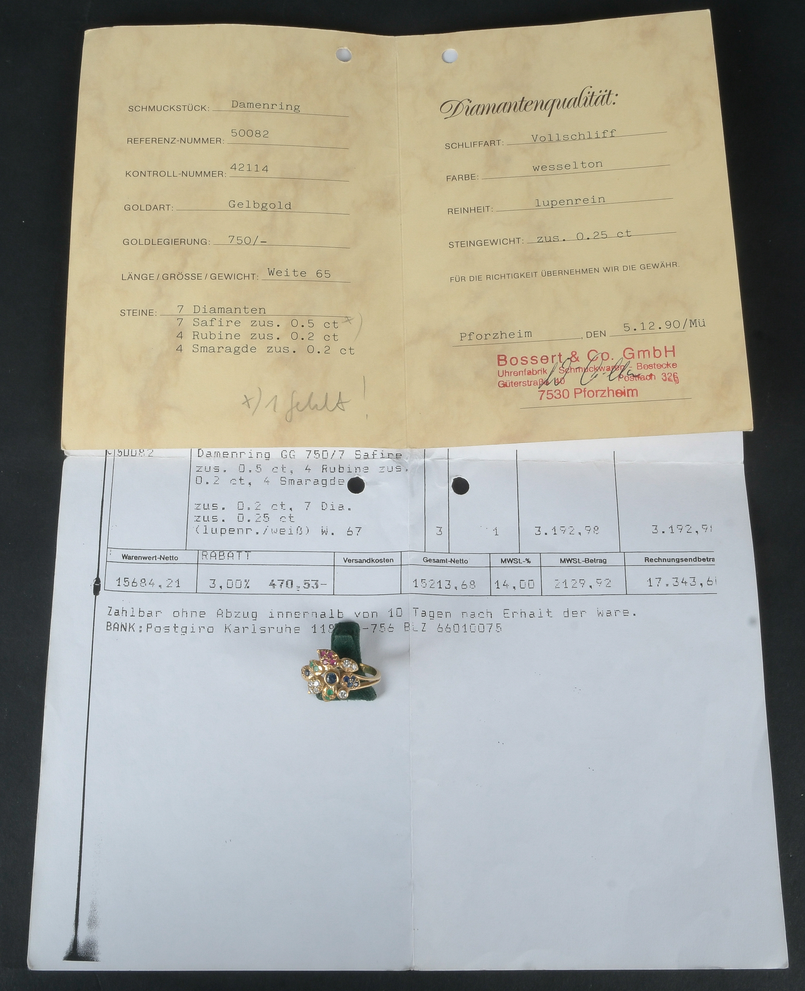 - Katalog-Nr: 2241Damenring. 18 kt Gold, besetzt mit sieben Brillanten, ca. 0,25 ct, sieben Saphiren, vier Smaragden und vier Rubinen, Gesamtgewicht ca. 5,91 g, Ringgröße 64. Zertifikat von Bossert & Co GmbH, Pforzheim 2.12.1990, und Rechnung über DM 3.192,00 liegen vor.o.L.