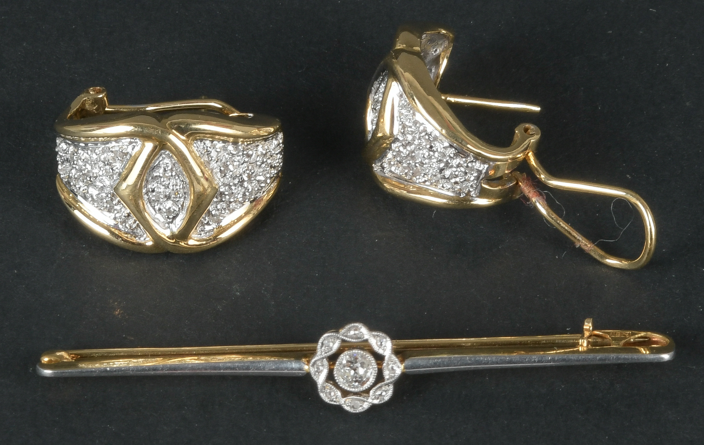 - Katalog-Nr: 2244Stabbrosche und Ohrstecker. 18 kt Gold, besetzt mit Diamanten, ca. 0,20 ct, Gesamtgewicht ca. 15,50 g. (Ring besch.)o.L.