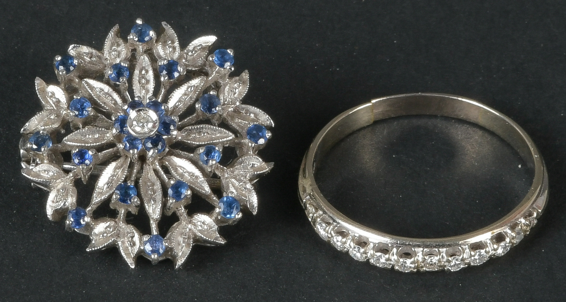 - Katalog-Nr: 2246Brosche und Damenring. 18 kt Gold, besetzt mit Brillanten, ca. 0,15 ct, und saphirfarbigen Steinen, Gesamtgewicht ca. 7,31 g, Ringgröße 58. (Ring besch.)o.L.